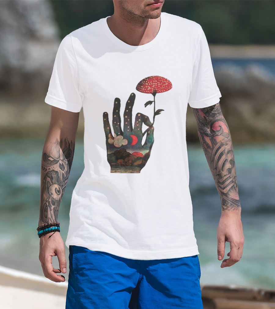 The Fly Agaric Psychedelic Hand with Night Sky and Moon T-shirt is designed for everyday wear and a consistent fit. Fabric is pre-shrunk ring-spun cotton with durable stitching. See the size chart below for exact measurements.