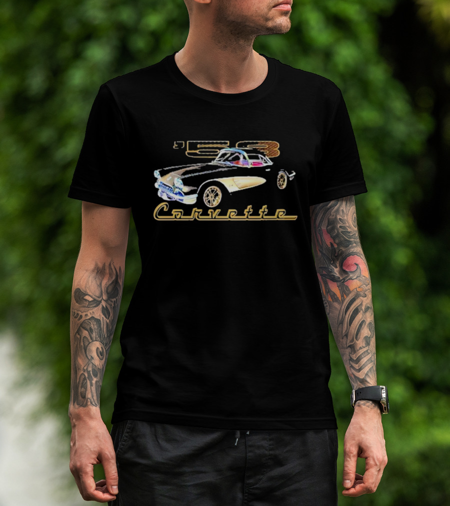 The '58 Corvette Classic Car T-shirt is designed for everyday wear and a consistent fit. Fabric is pre-shrunk ring-spun cotton with durable stitching. See the size chart below for exact measurements.