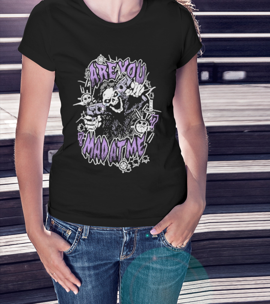 ARE YOU MAD AT ME Skeletal Figure With Guns And Cartoon Style Elements T-Shirt
