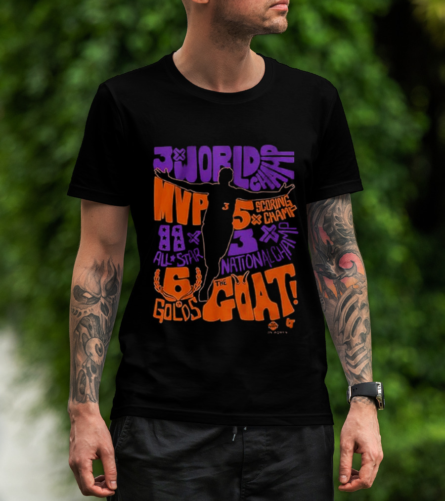 The 3x World Champ MVP All-Star 6 Golds 5x Scoring Champ 3x National Champ The GOAT T-shirt is designed for everyday wear and a consistent fit. Fabric is pre-shrunk ring-spun cotton with durable stitching. See the size chart below for exact measurements.