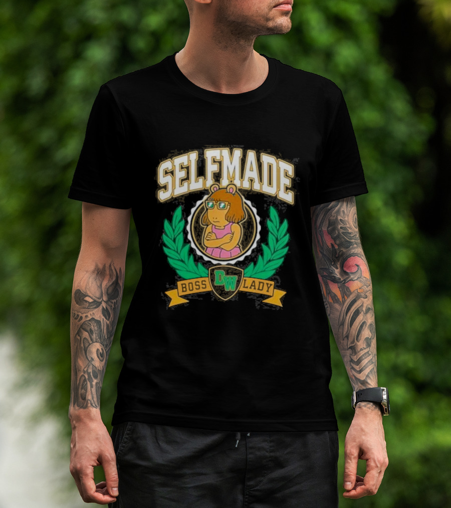 The Selfmade Tired D.W. Meme Boss Lady Retroki T-shirt is designed for everyday wear and a consistent fit. Fabric is pre-shrunk ring-spun cotton with durable stitching. See the size chart below for exact measurements.