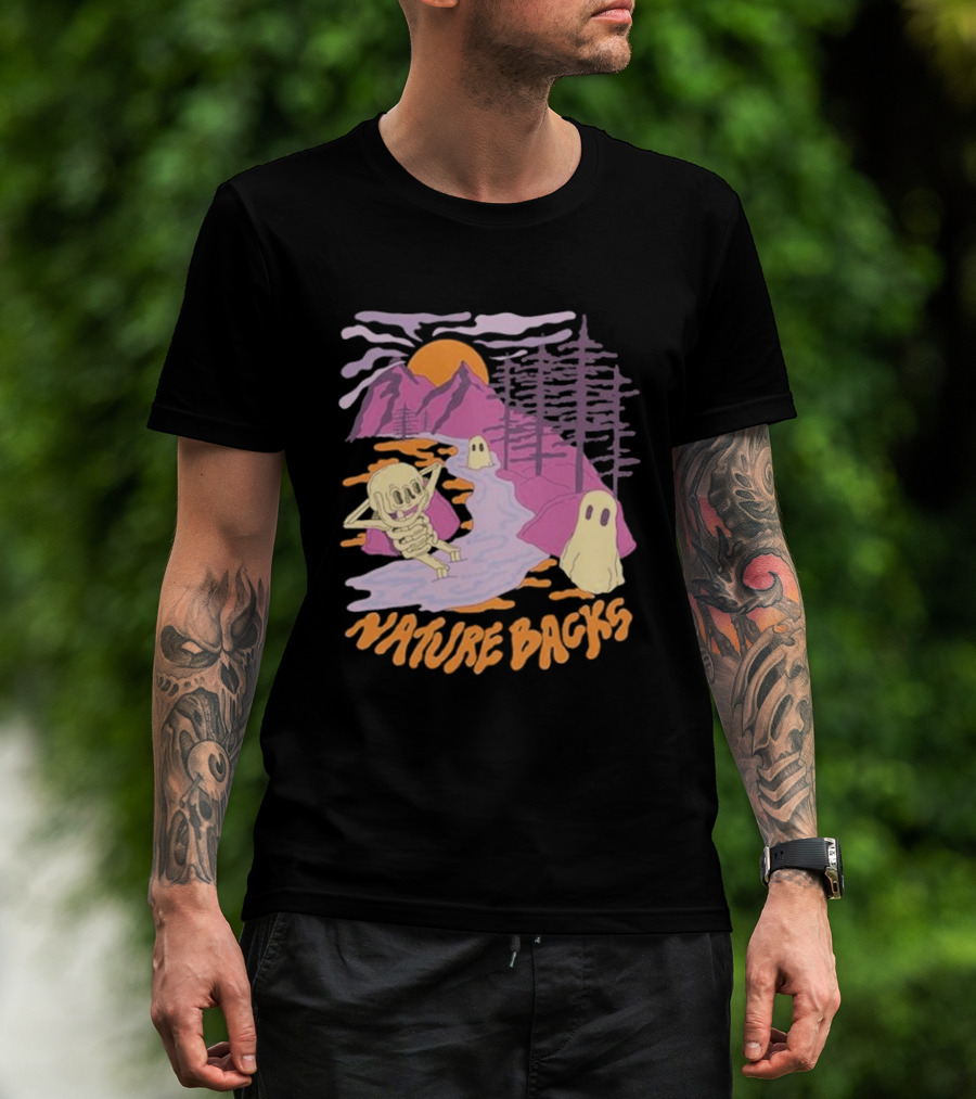 The Nature Backs Sleepy Hollow Skeleton and Ghosts by Mountains and Forests T-shirt is designed for everyday wear and a consistent fit. Fabric is pre-shrunk ring-spun cotton with durable stitching. See the size chart below for exact measurements.