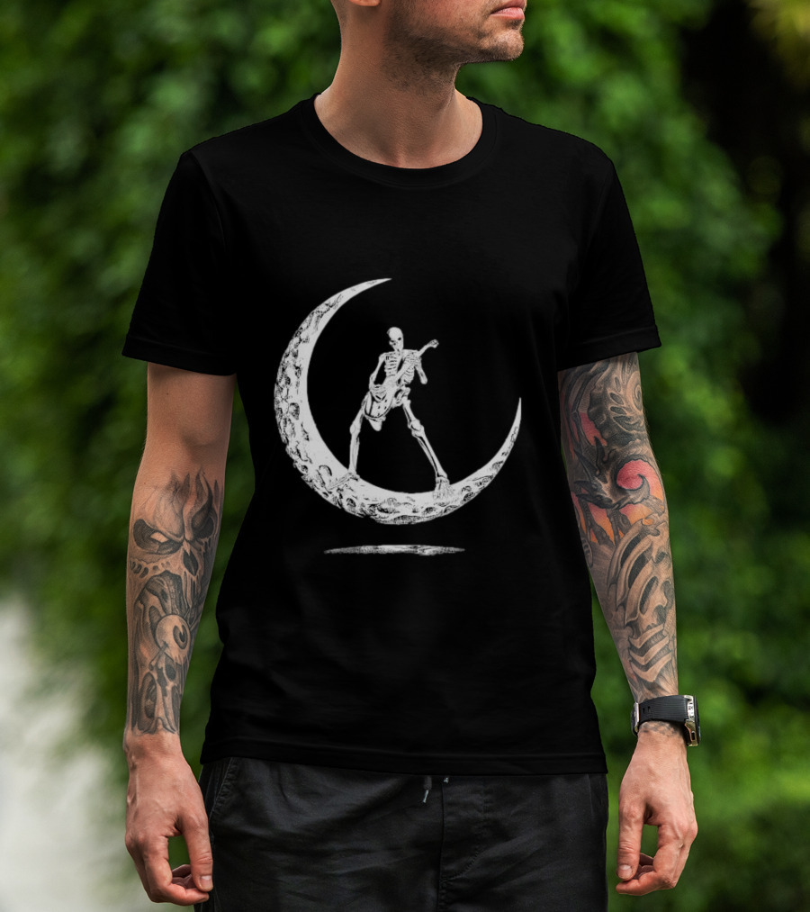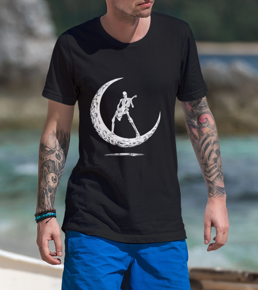 Skeleton Playing Guitar On Crescent Moon Rock And Roll Band T-Shirt