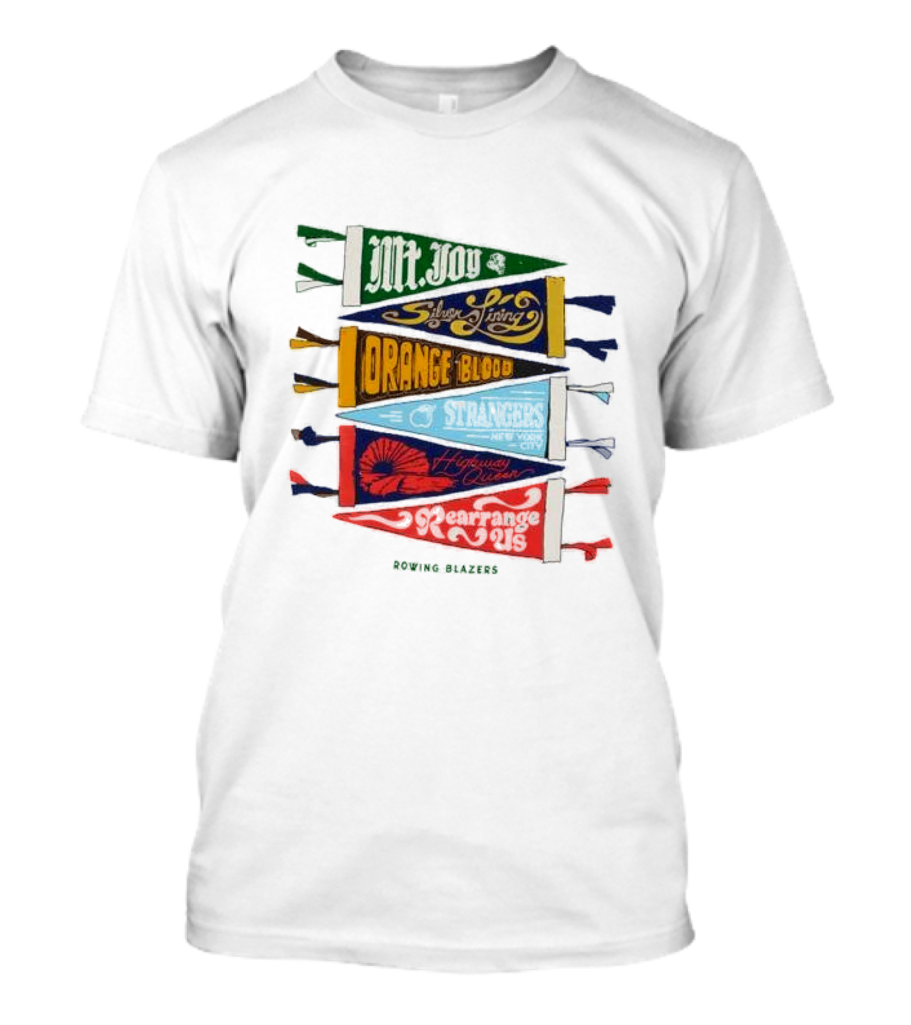 The Rowing Blazers Mt Joy Silver Lining Orange Blood Strangers Rearrange Us T-shirt is designed for everyday wear and a consistent fit. Fabric is pre-shrunk ring-spun cotton with durable stitching. See the size chart below for exact measurements.