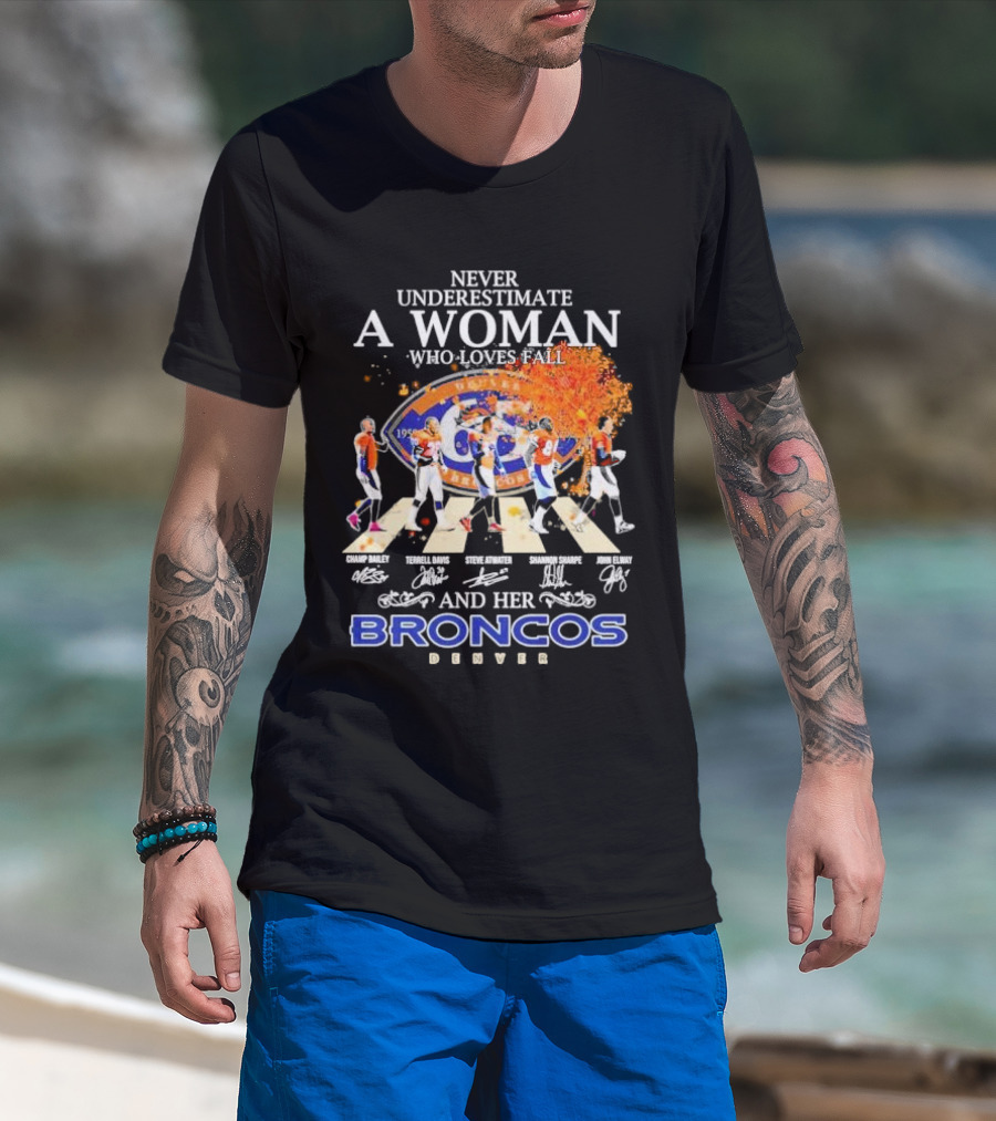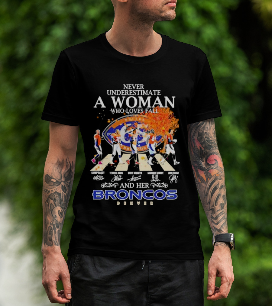 Never Underestimate A Woman Who Loves Fall And Her Broncos Denver Abbey Road Signature With Players Champ Bailey Terrell Davis Steve Atwater Shannon Sharpe John Elway T-Shirt