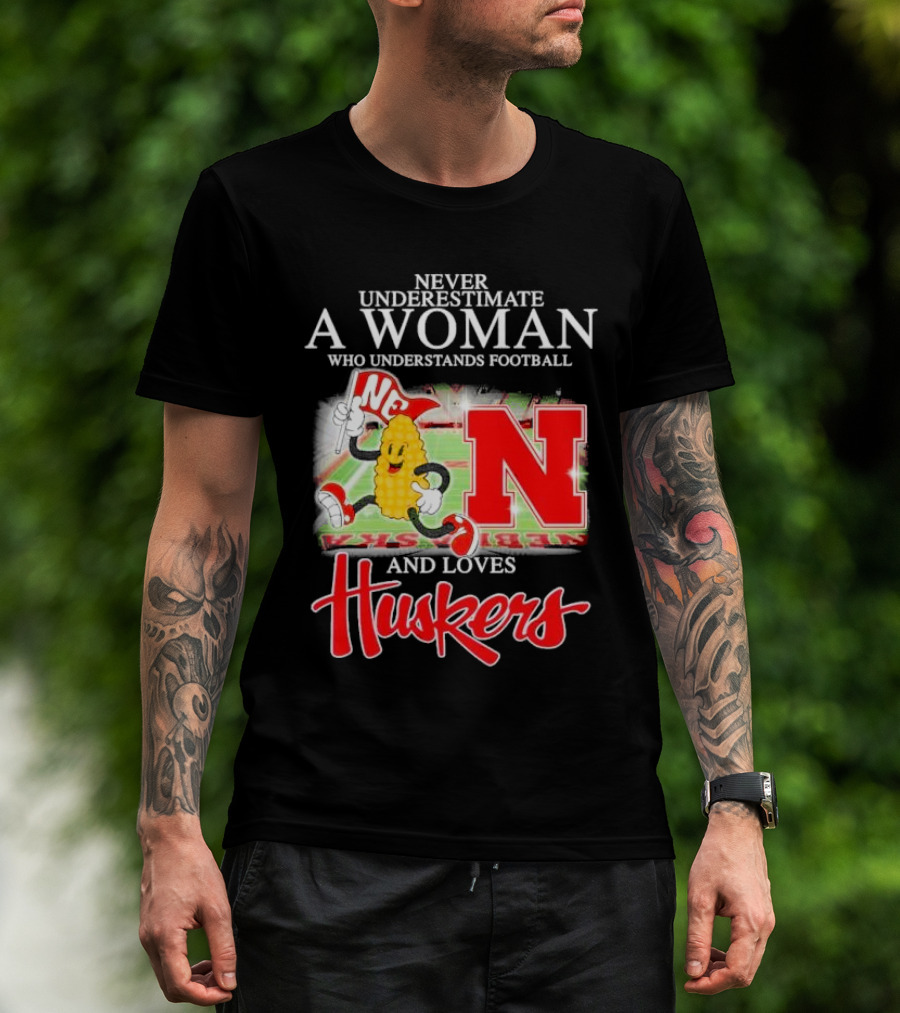 Never Underestimate A Woman Who Understands Football And Loves Huskers Corn Mascot Logo NC T-Shirt
