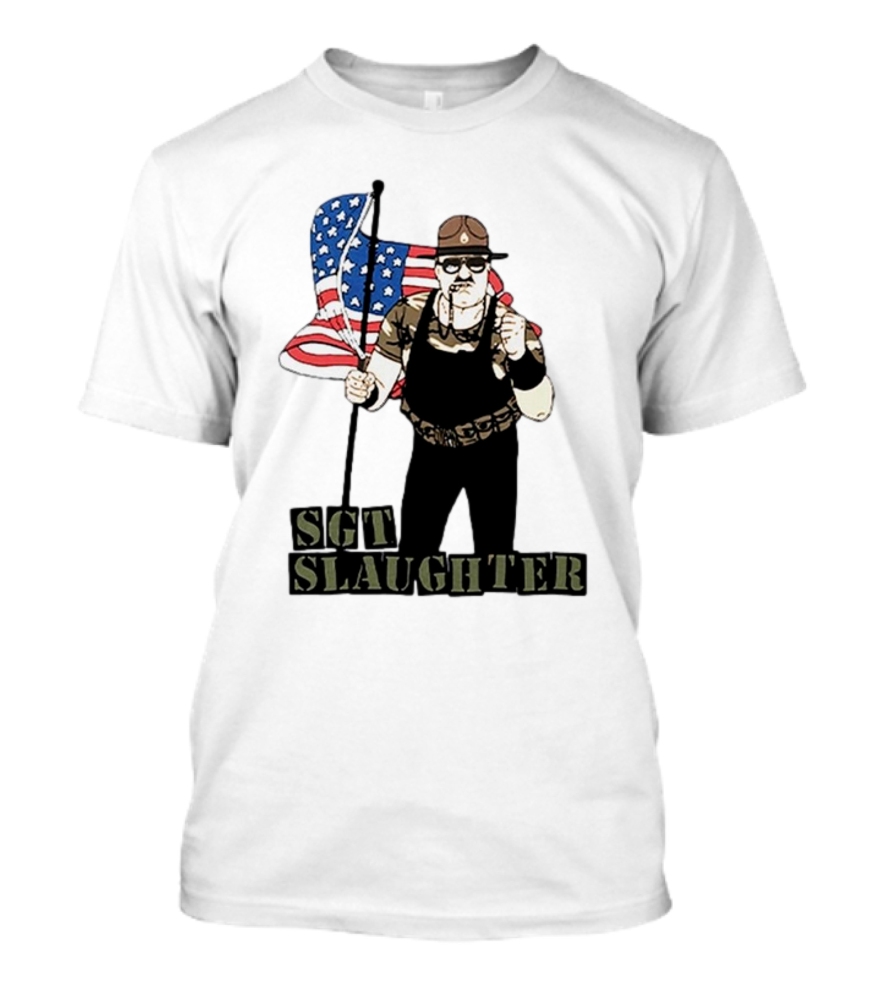 The SGT Slaughter Holding American Flag Vintage T-shirt is designed for everyday wear and a consistent fit. Fabric is pre-shrunk ring-spun cotton with durable stitching. See the size chart below for exact measurements.