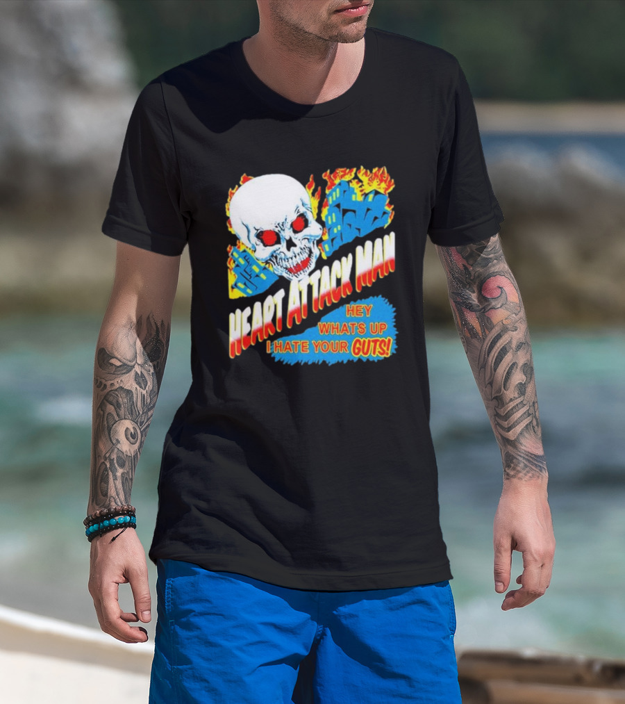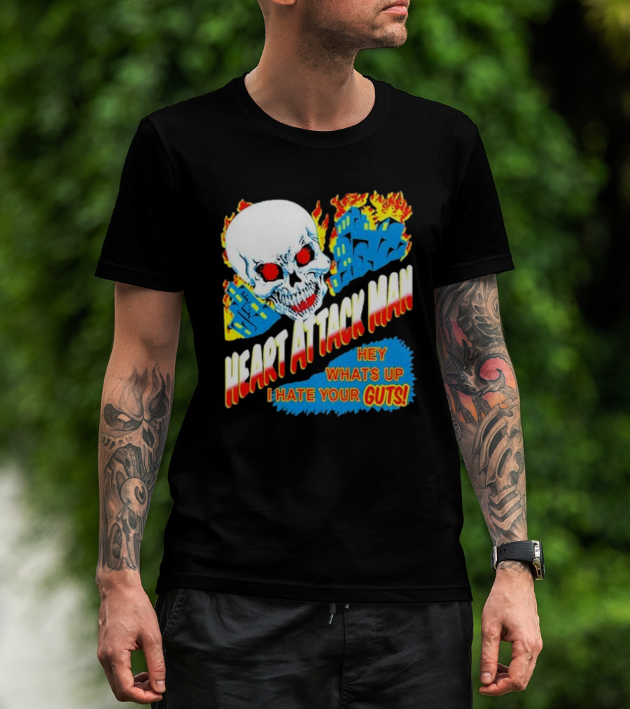 Heart Attack Man Hey Whats Up I Hate Your Guts Flaming Skull And Fiery Comic Book Style Buildings T-Shirt