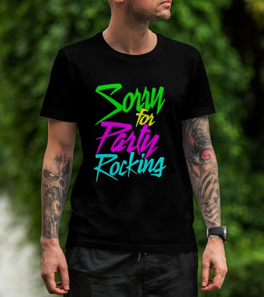 The Sorry for Party Rocking Neon 90s T-shirt is designed for everyday wear and a consistent fit. Fabric is pre-shrunk ring-spun cotton with durable stitching. See the size chart below for exact measurements.