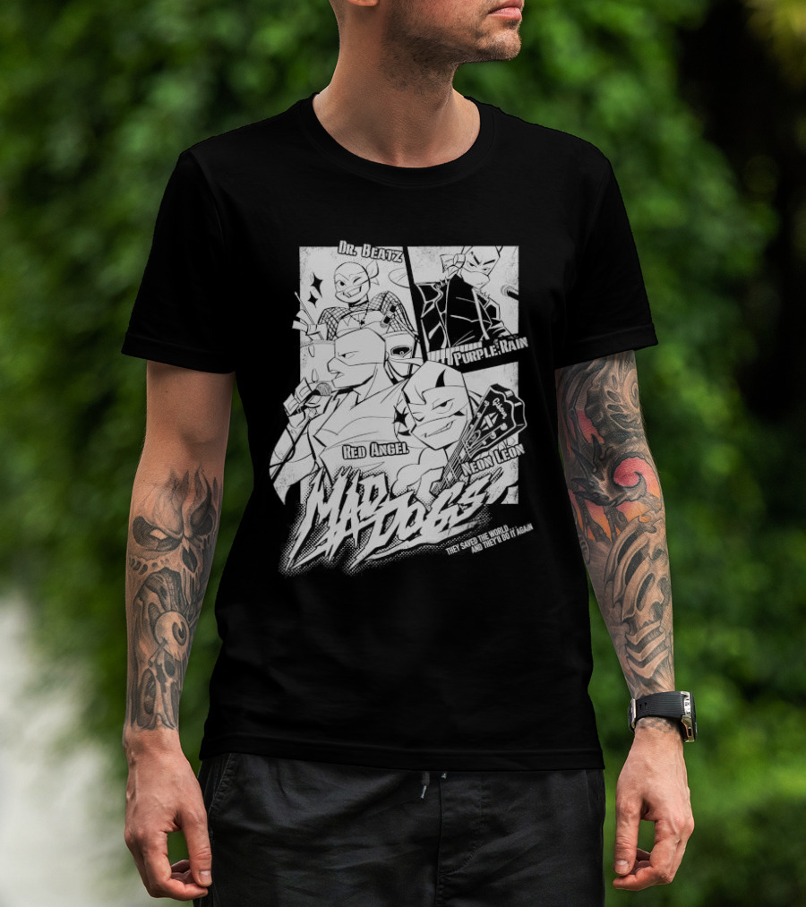 The Mad Dogs Dr Beatz Purple Rain Red Angel Neon Leon They Saved The World And They’ll Do It Again T-shirt is designed for everyday wear and a consistent fit. Fabric is pre-shrunk ring-spun cotton with durable stitching. See the size chart below for exact measurements.