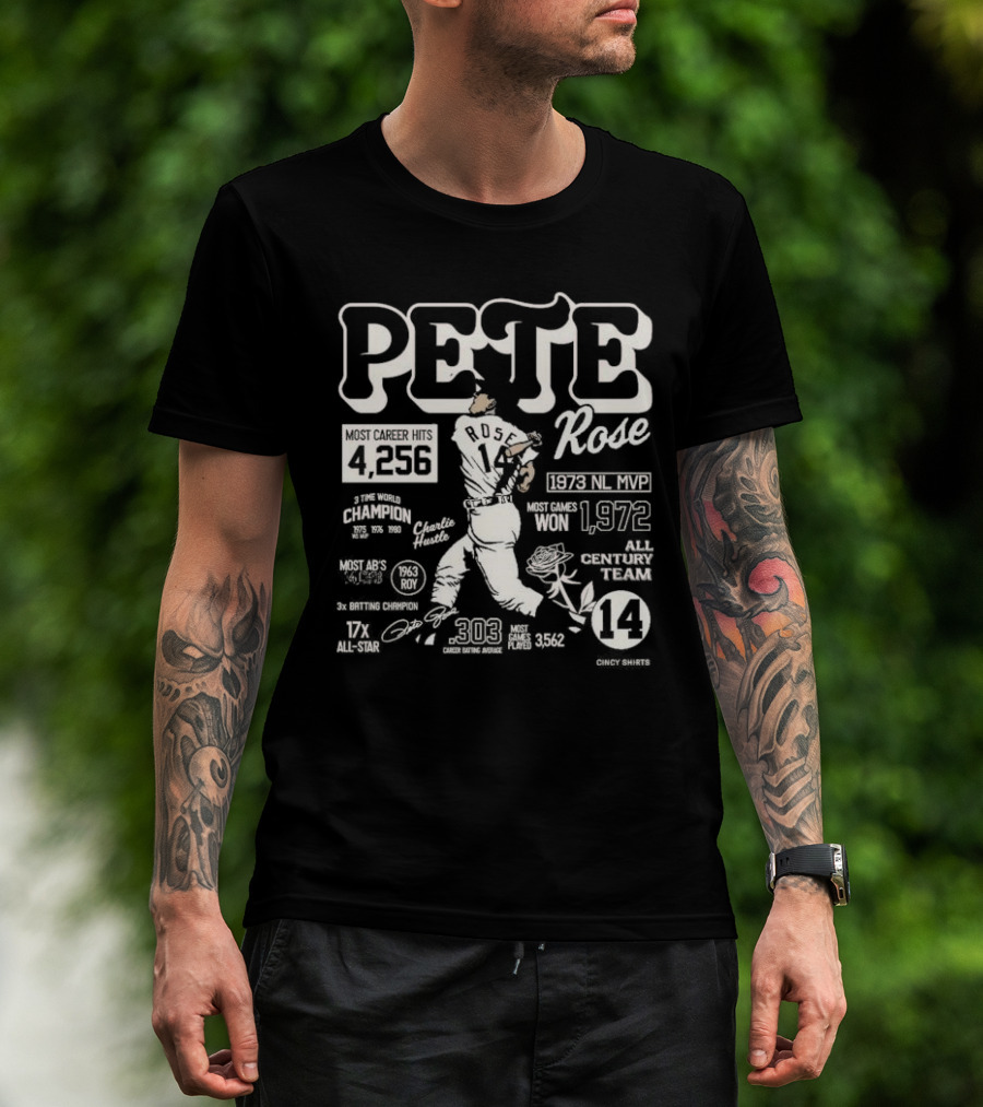 Pete Rose Career Stats 4256 Hits 303 Average 17x All-Star 1973 MVP 3x Batting Champion Charlie Hustle Player Baseball T-Shirt