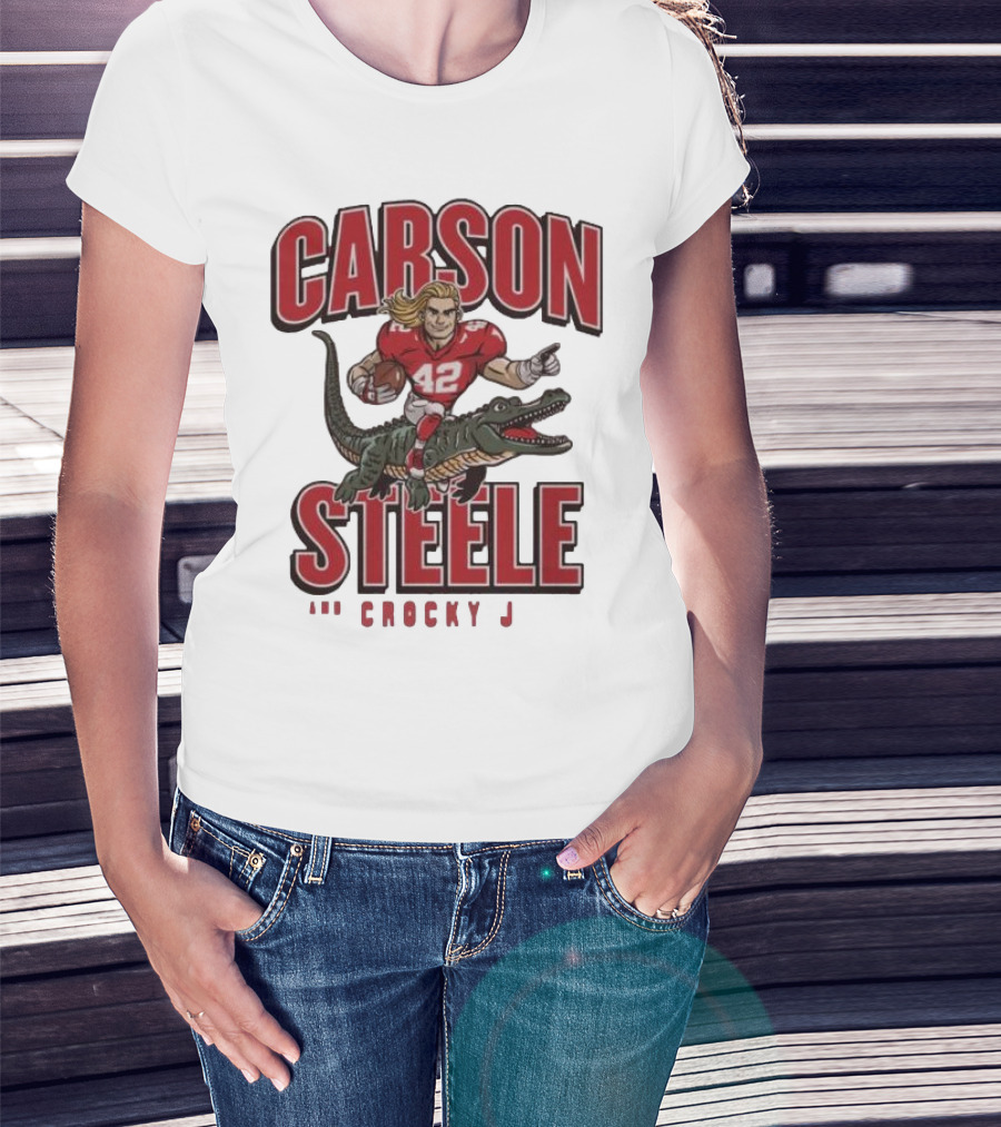 The Carson Steele Riding Crocky J Football Kansas City Chiefs T-shirt is designed for everyday wear and a consistent fit. Fabric is pre-shrunk ring-spun cotton with durable stitching. See the size chart below for exact measurements.