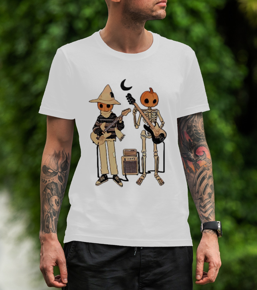 Libby Frame Pumpkin Skeleton Musicians With Crescent Moon T-Shirt