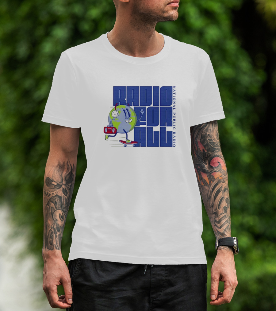 RADIO FOR ALL National Public Radio Cartoon Skateboarding Globe T-Shirt