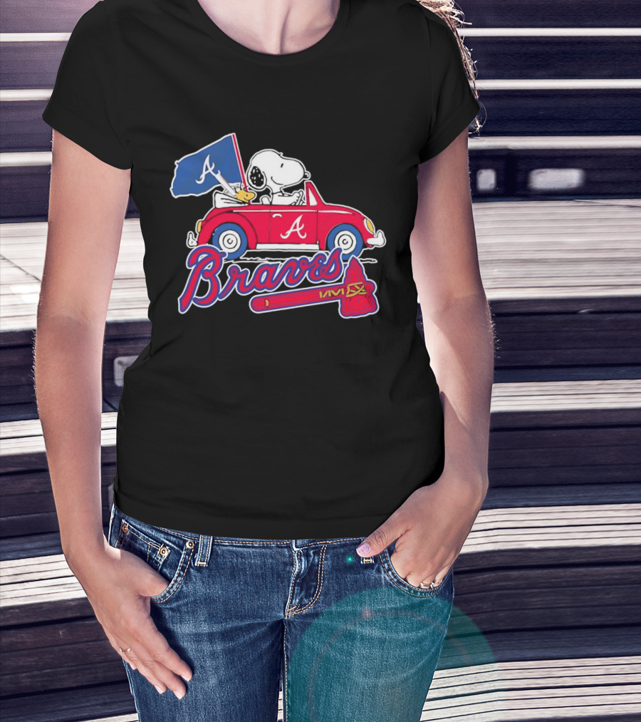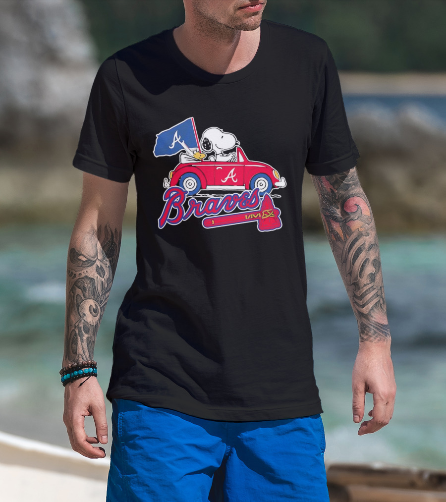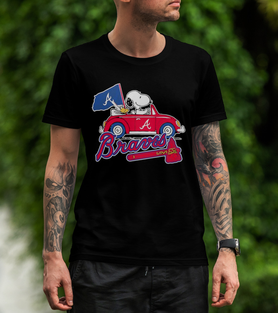 Snoopy And Woodstock Driving Car Atlanta Braves Logo Peanuts Cartoon T-Shirt