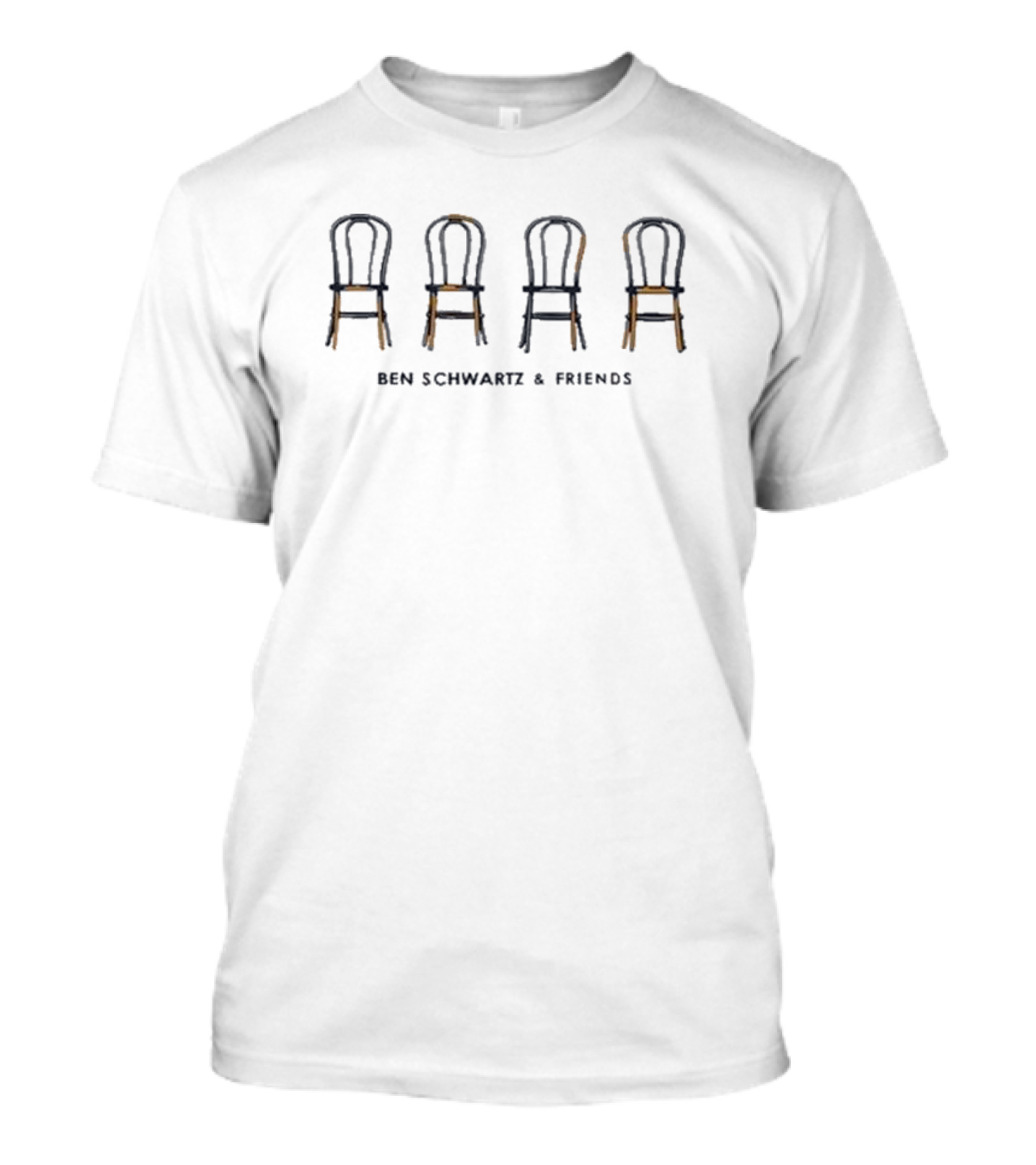 The Rejectedjokes Ben Schwartz and Friends Four Chairs T-shirt is designed for everyday wear and a consistent fit. Fabric is pre-shrunk ring-spun cotton with durable stitching. See the size chart below for exact measurements.