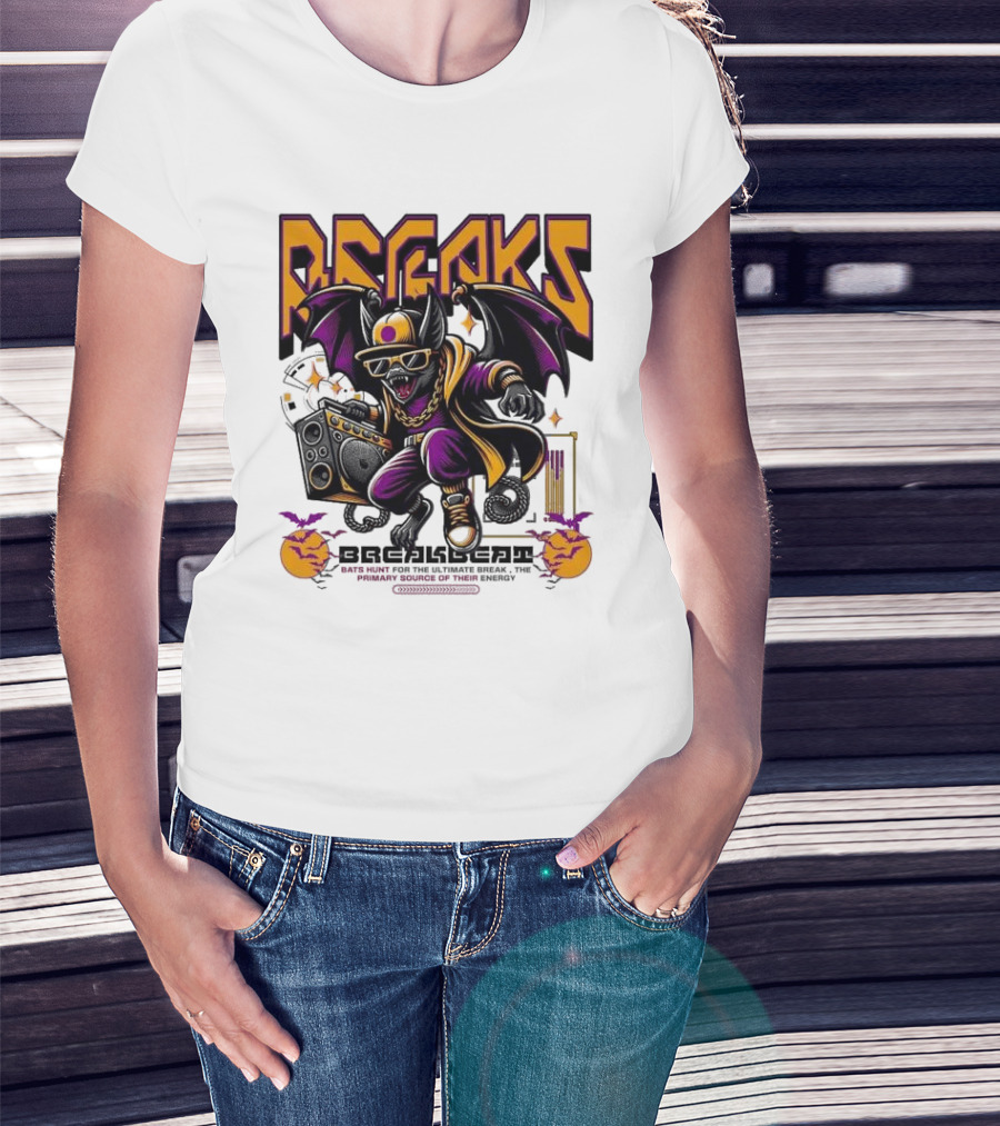 The Breakbeat Bat Breaks Bats Hunt For The Ultimate Break Primary Source Of Energy T-shirt is designed for everyday wear and a consistent fit. Fabric is pre-shrunk ring-spun cotton with durable stitching. See the size chart below for exact measurements.