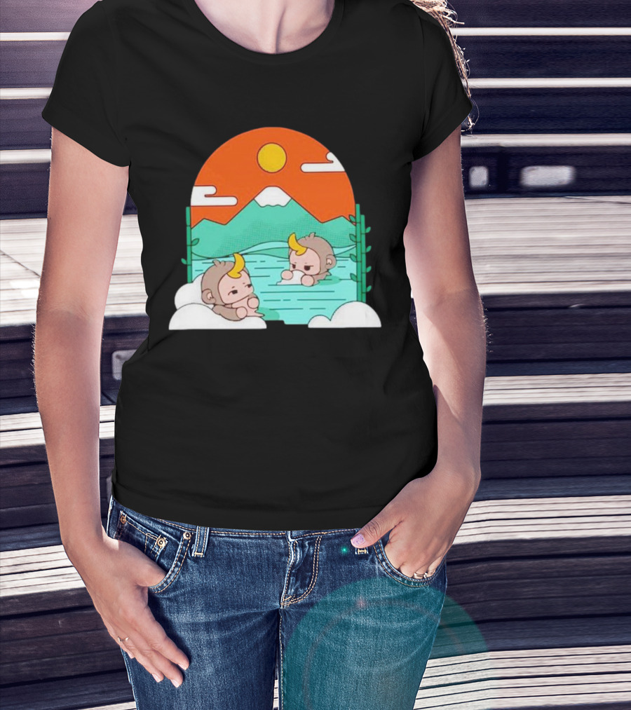 The Tranquil Monkey Hot Spring Relaxation Scene With Mountains And Sun T-Shirt