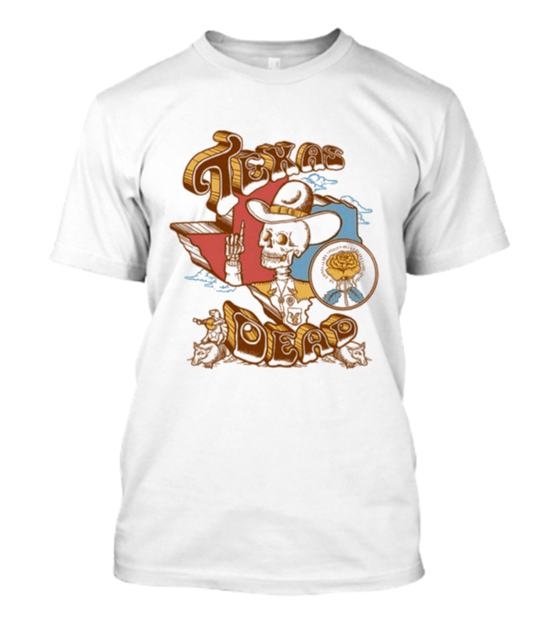 The Texas Dead Skeleton Cowboy Rose Austin Texas T-shirt is designed for everyday wear and a consistent fit. Fabric is pre-shrunk ring-spun cotton with durable stitching. See the size chart below for exact measurements.