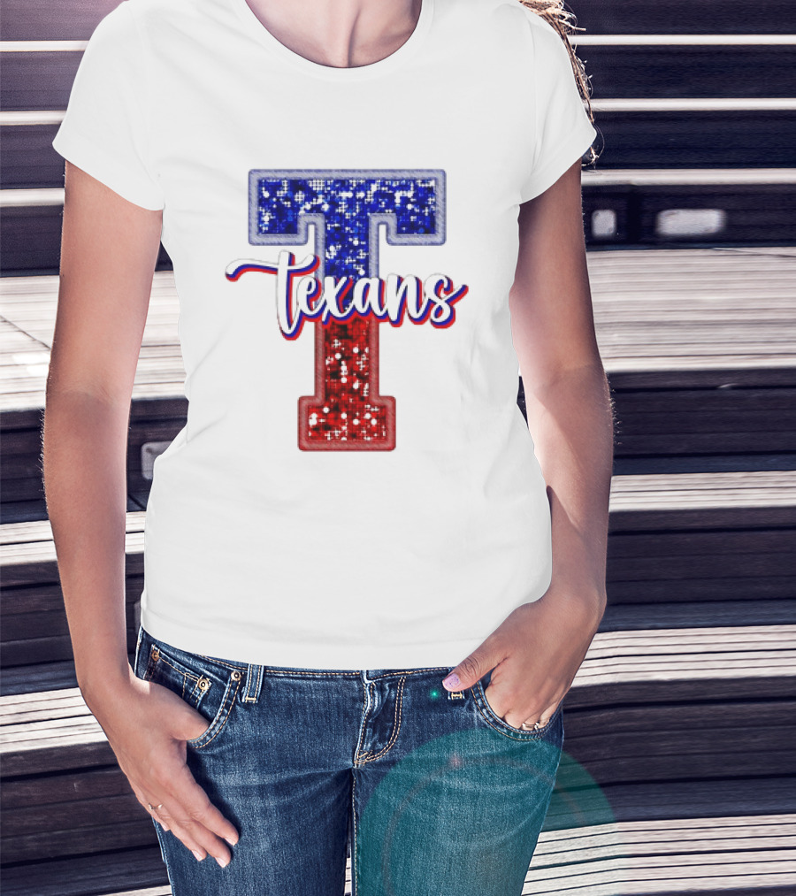 The Texans Glitter Football T Red Blue T-shirt is designed for everyday wear and a consistent fit. Fabric is pre-shrunk ring-spun cotton with durable stitching. See the size chart below for exact measurements.