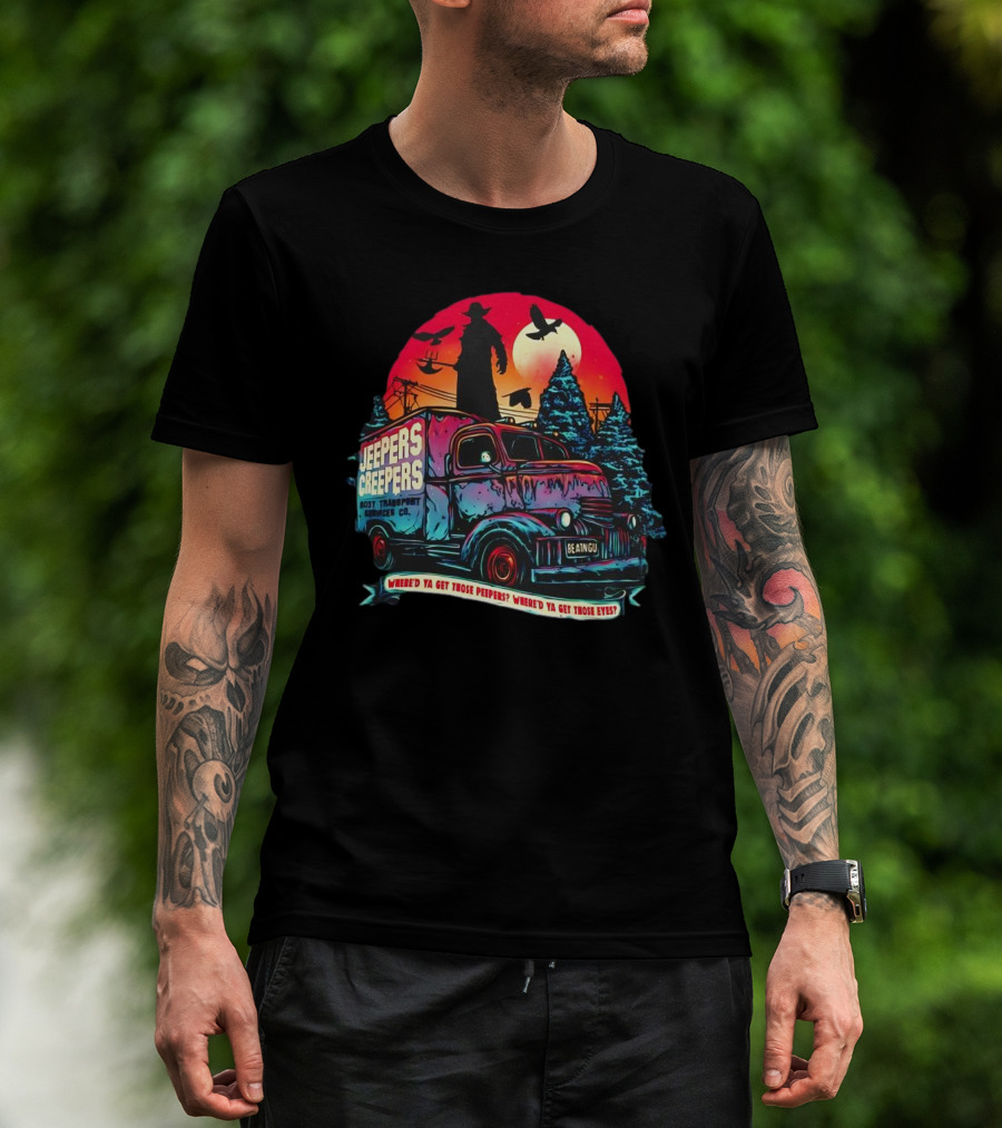 Jeepers Creepers Body Transport Services Co Where’d Ya Get Those Peepers Eyes Vintage Truck Haunted Forest Scene T-Shirt