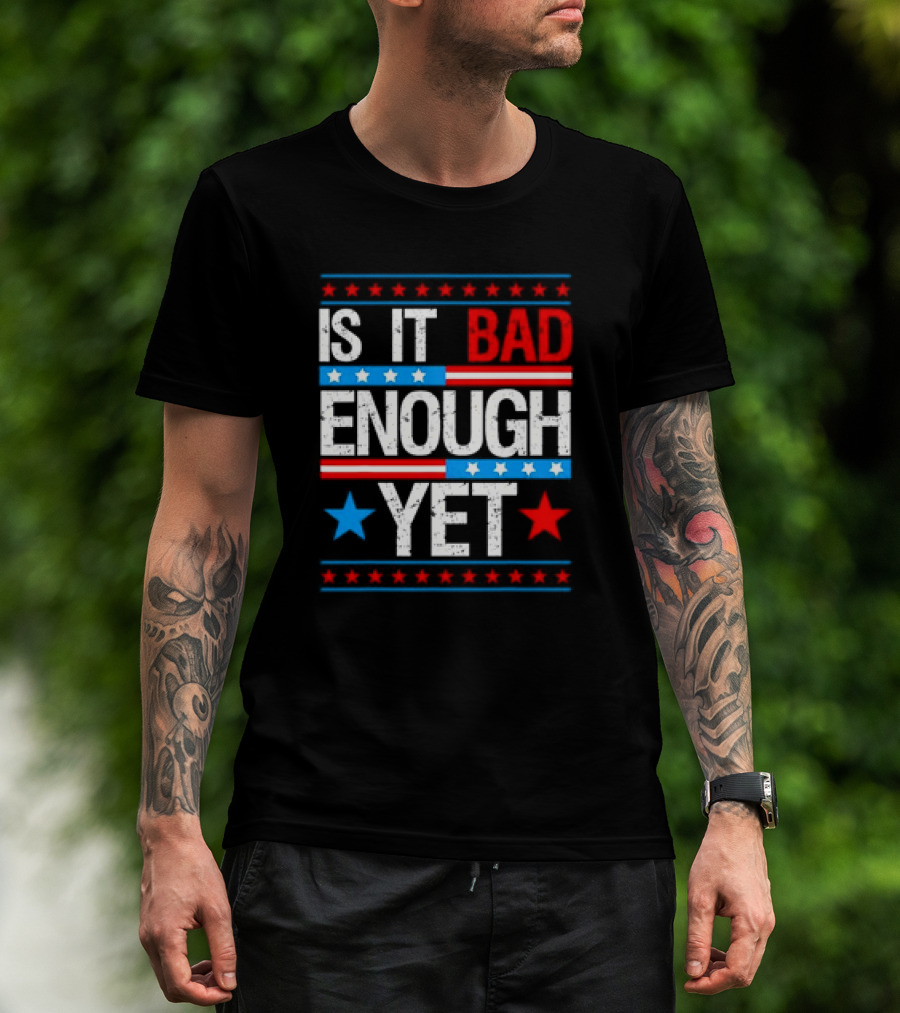 The Patriotic Is It Bad Enough Yet Stars Stripes Political T-shirt is designed for everyday wear and a consistent fit. Fabric is pre-shrunk ring-spun cotton with durable stitching. See the size chart below for exact measurements.