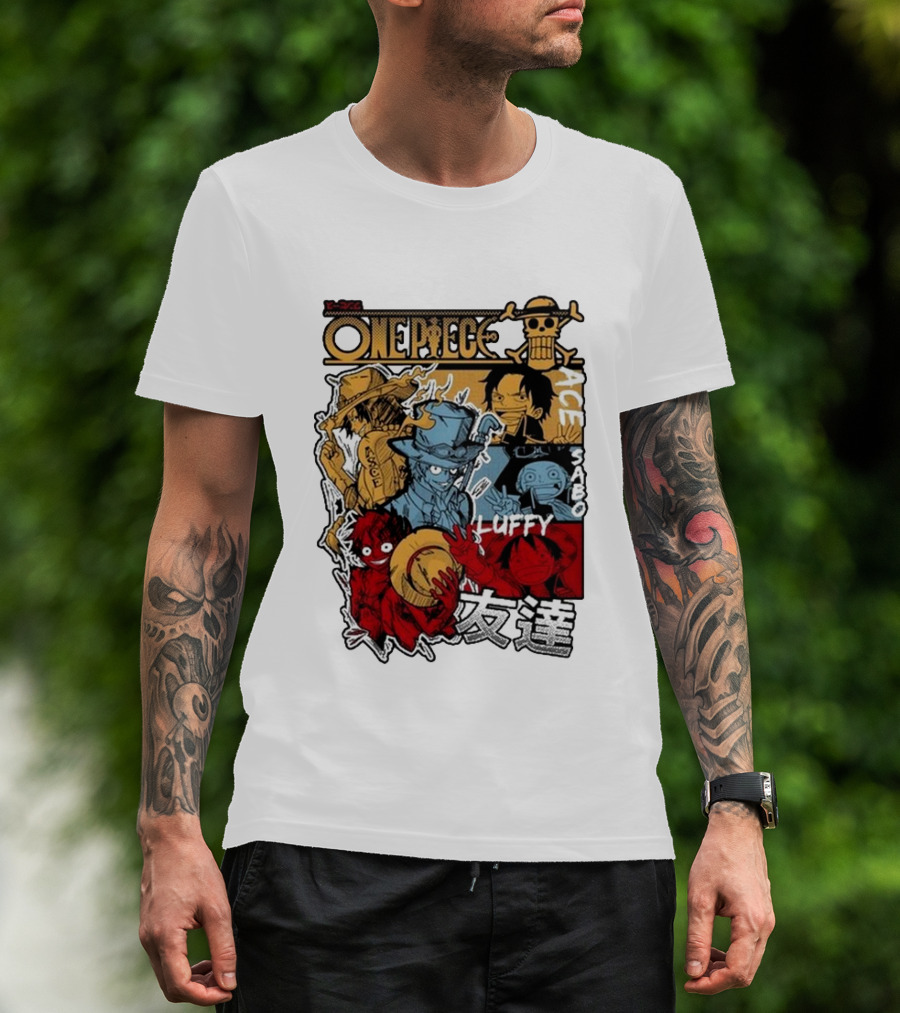 The One Piece Luffy Ace Sabo Brothers Friendship T-shirt is designed for everyday wear and a consistent fit. Fabric is pre-shrunk ring-spun cotton with durable stitching. See the size chart below for exact measurements.