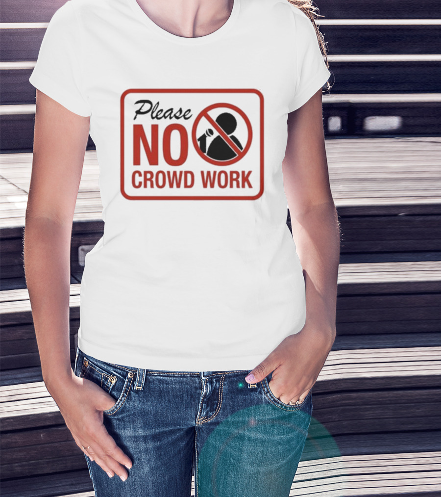 The Please No Crowd Work Microphone T-shirt is designed for everyday wear and a consistent fit. Fabric is pre-shrunk ring-spun cotton with durable stitching. See the size chart below for exact measurements.