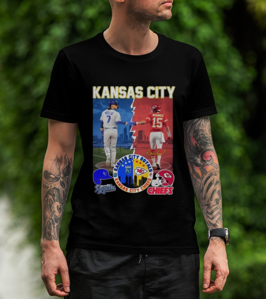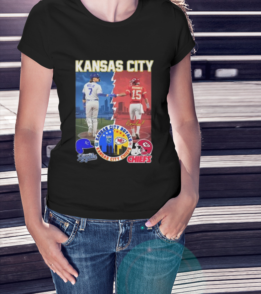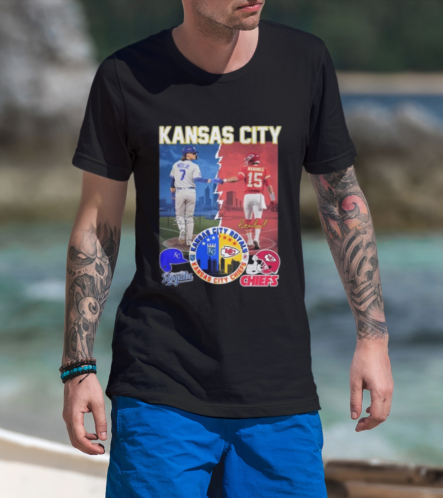 Kansas City Royals Bobby Witt Jr And Chiefs Patrick Mahomes Skyline Logos And Signatures T-Shirt