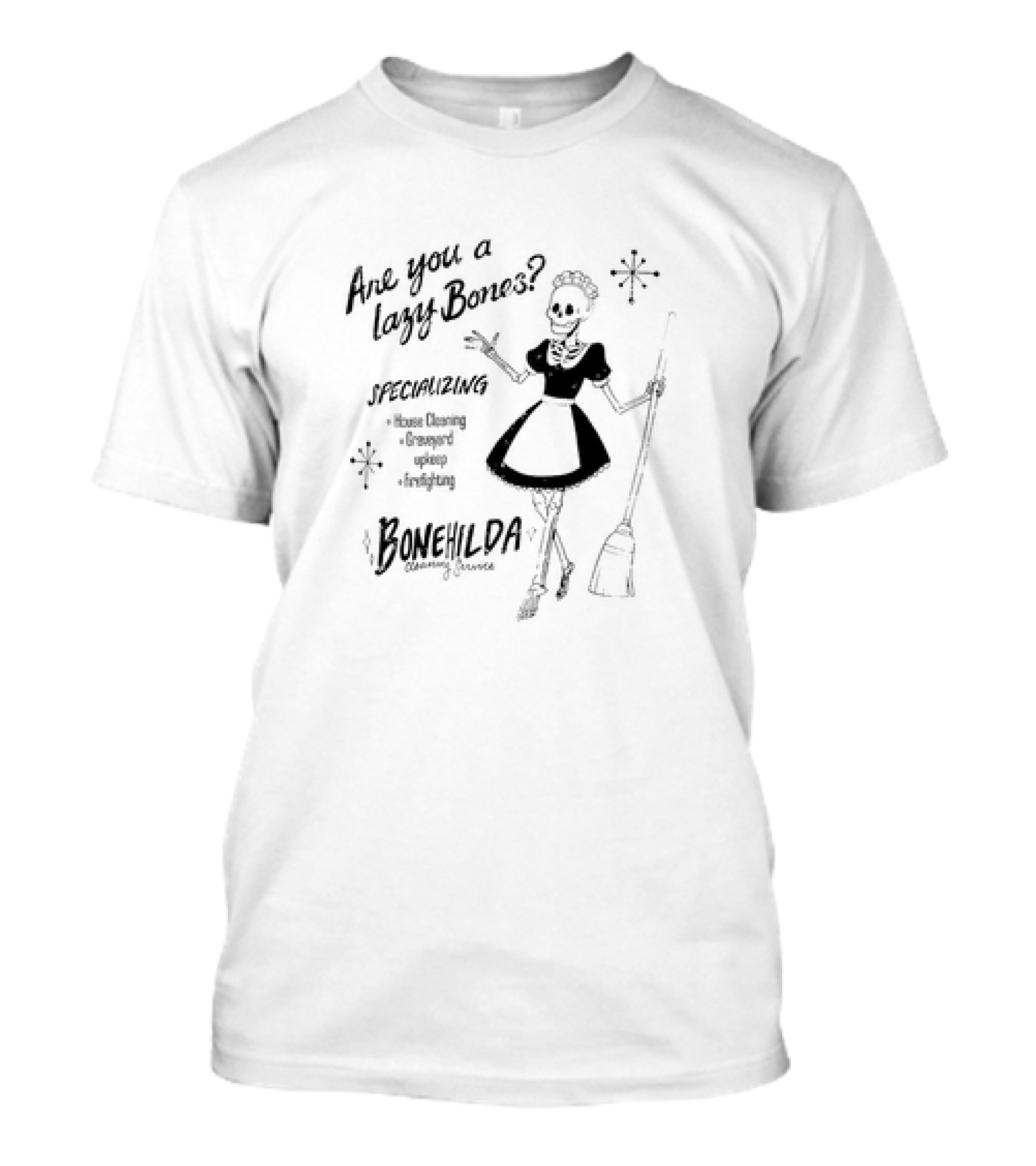 The Are You a Lazy Bones Specializing House Cleaning Graveyard Upkeep Babysitting Bonehilda Cleaning Services T-shirt is designed for everyday wear and a consistent fit. Fabric is pre-shrunk ring-spun cotton with durable stitching. See the size chart below for exact measurements.