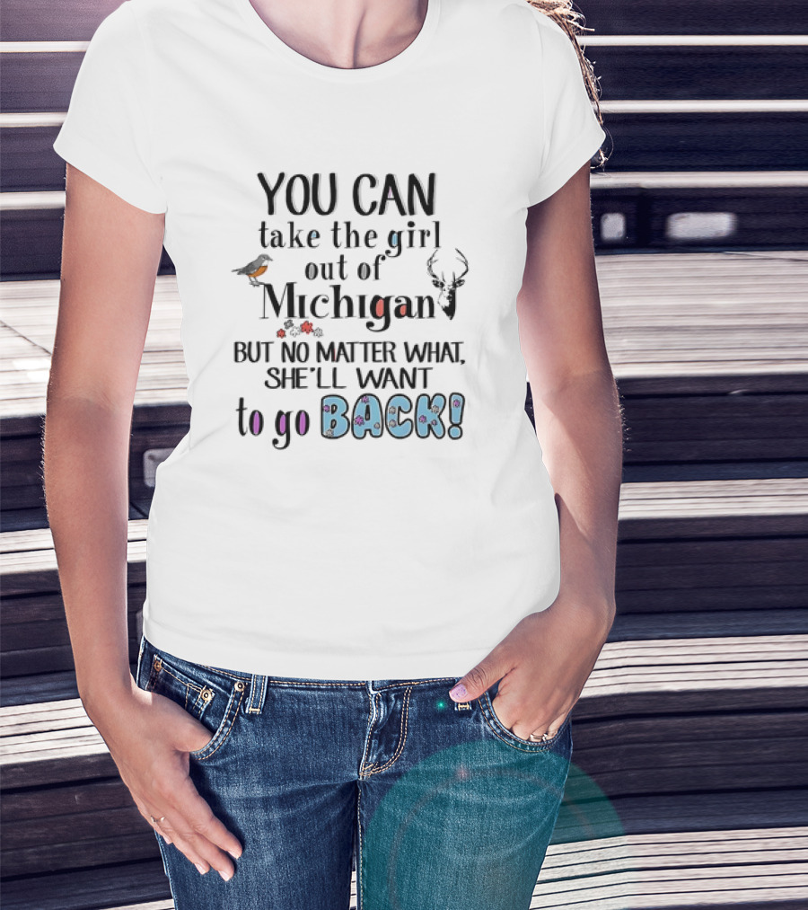 You Can Take The Girl Out Of Michigan But No Matter What She’ll Want To Go Back Deer Bird Flowers T-Shirt