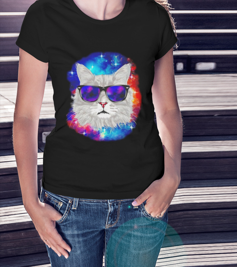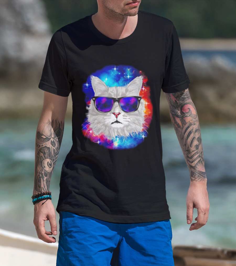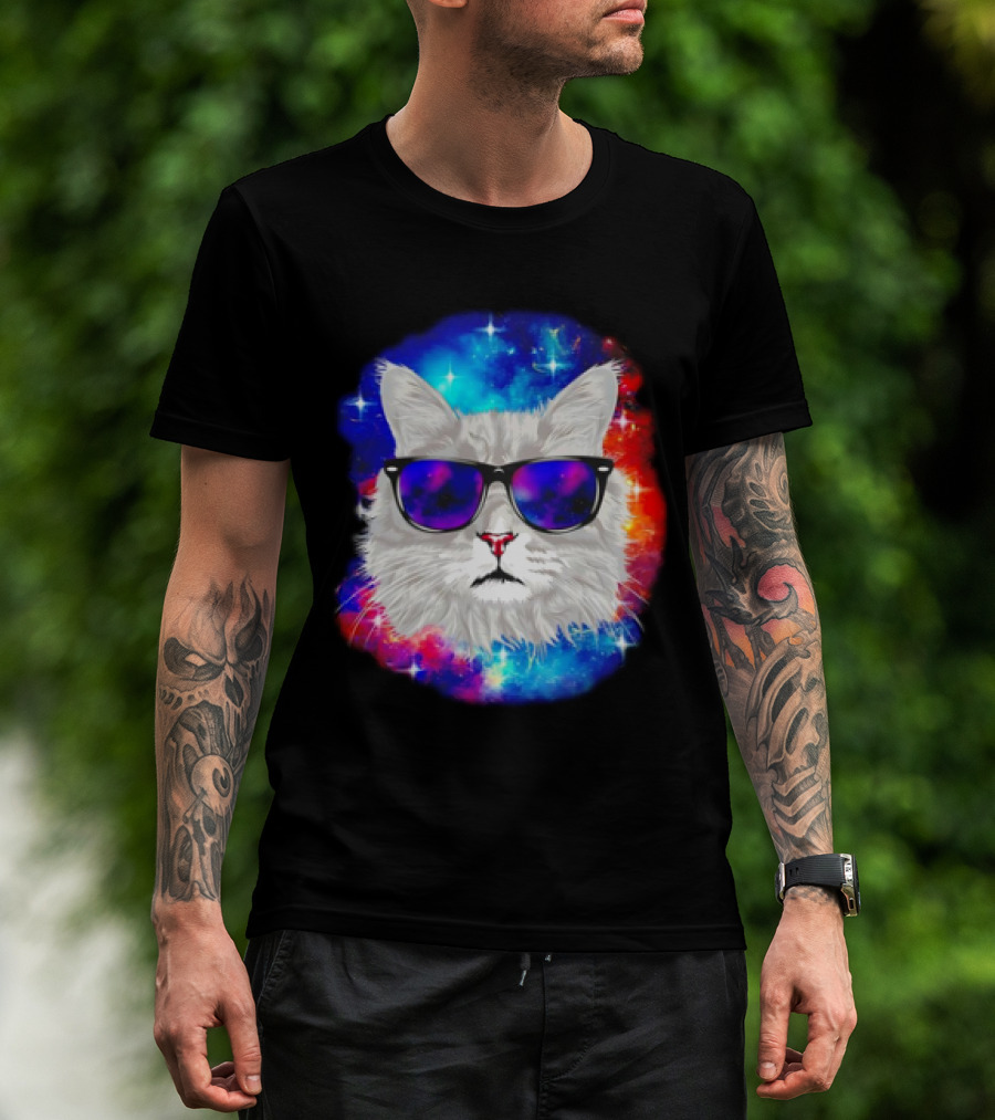 The Cool Cat Space Shades Galaxy T-shirt is designed for everyday wear and a consistent fit. Fabric is pre-shrunk ring-spun cotton with durable stitching. See the size chart below for exact measurements.
