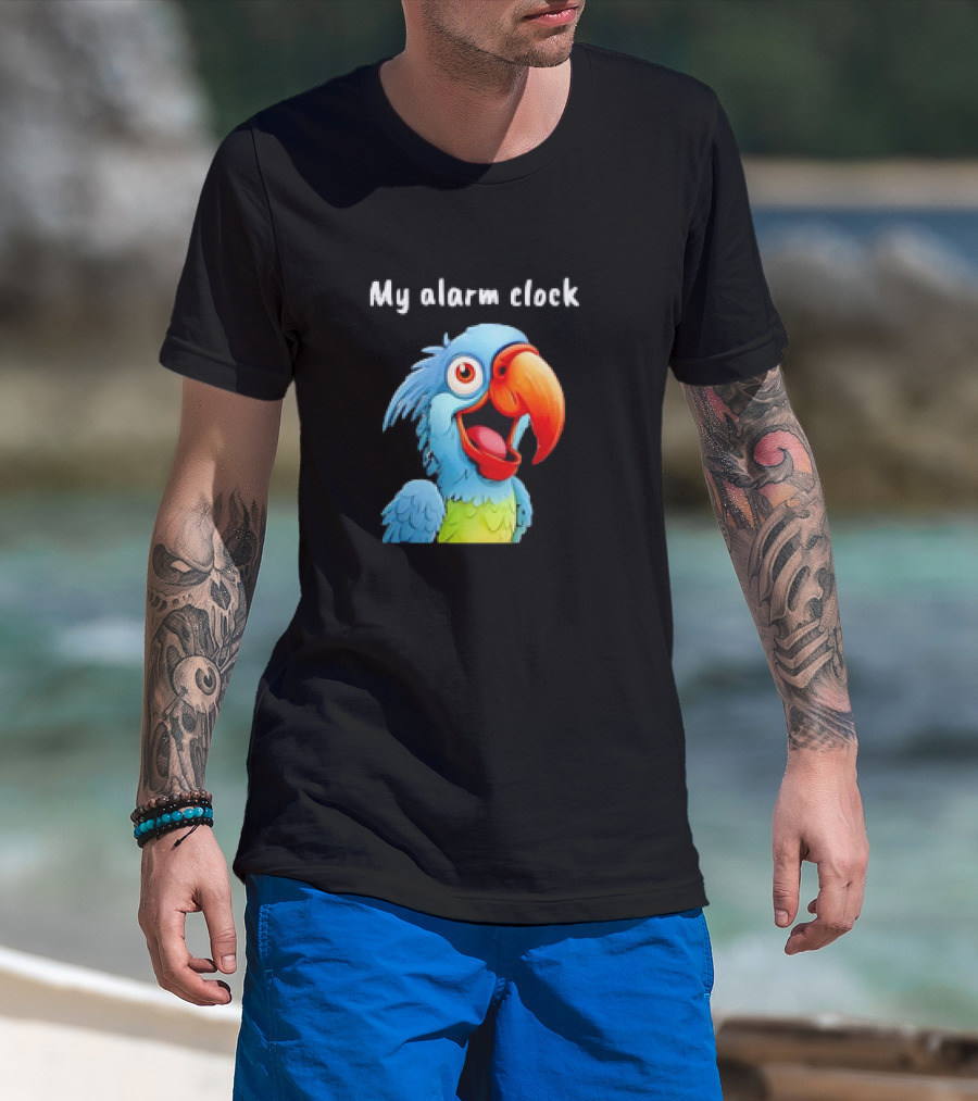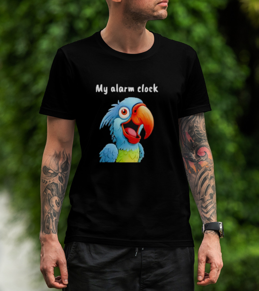The My Alarm Clock Parrot Alarm T-shirt is designed for everyday wear and a consistent fit. Fabric is pre-shrunk ring-spun cotton with durable stitching. See the size chart below for exact measurements.