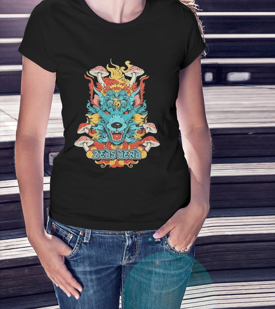 Zeds Dead Psychedelic Wolf And Mushrooms Imagery Navy T-Shirt