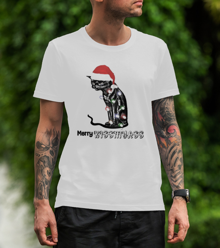 Merry Kiss My Ass Cat Christmas Lights Santa Hat T-Shirt