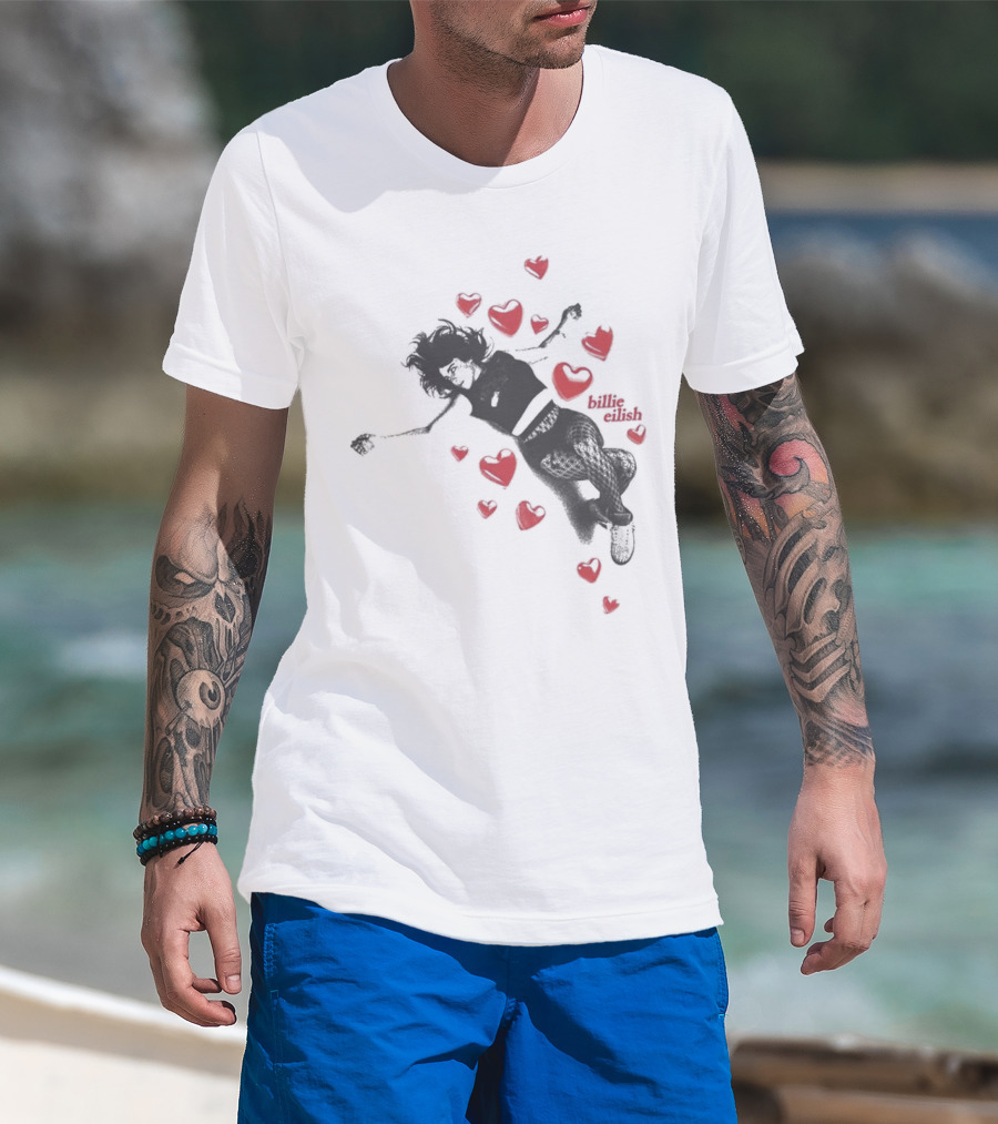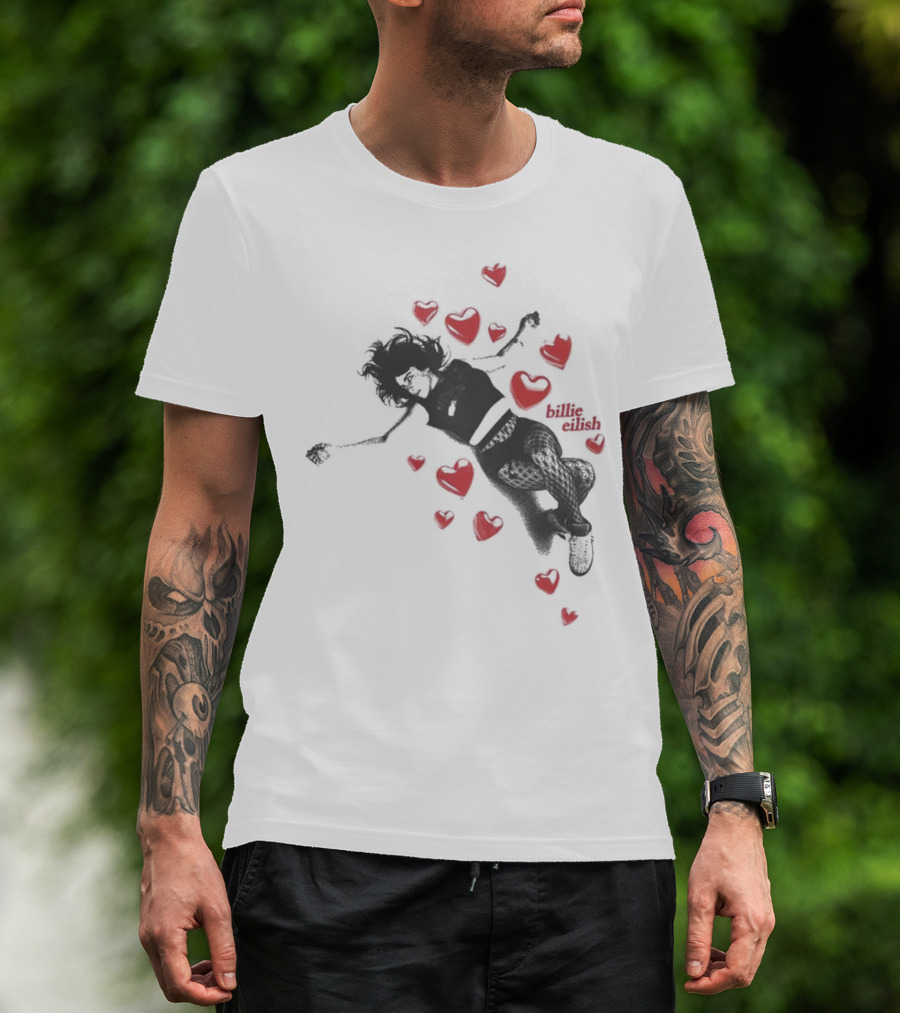 The Billie Eilish Surrounded by Floating Red Hearts Valentine T-shirt is designed for everyday wear and a consistent fit. Fabric is pre-shrunk ring-spun cotton with durable stitching. See the size chart below for exact measurements.