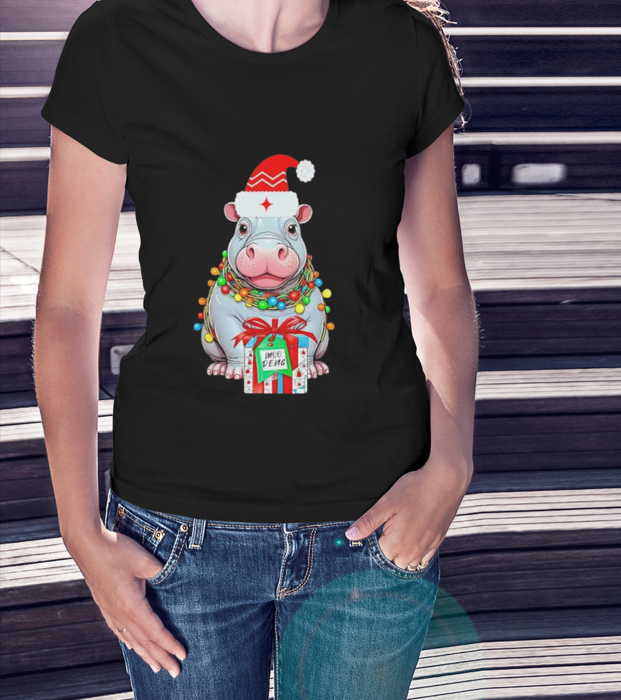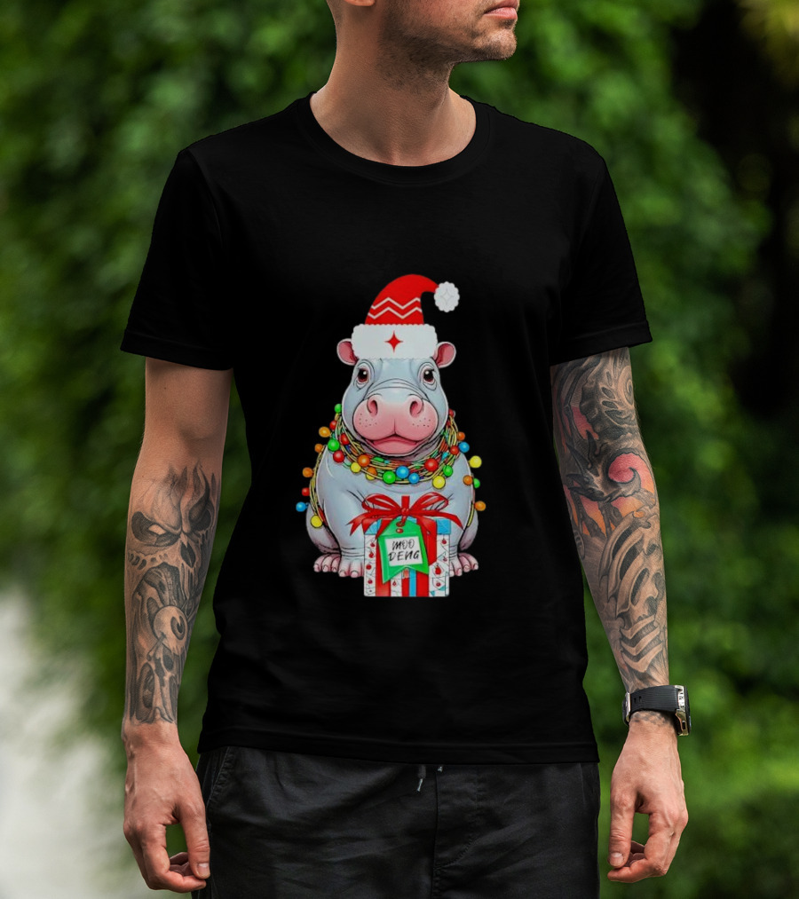 Moo Deng Merry Christmas Lights Tree Santa Hippo With Gift T-Shirt
