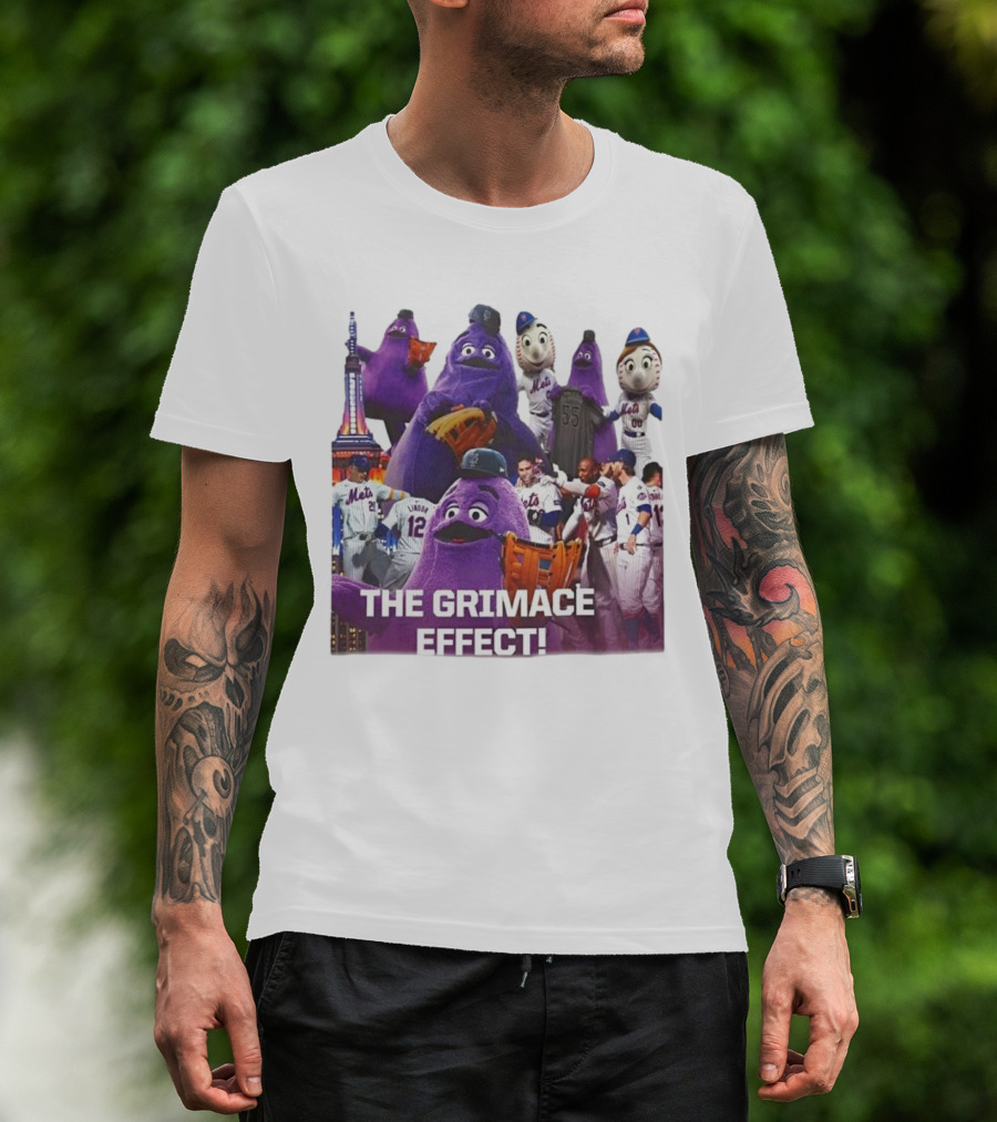 New York Mets The Grimace Effect Baseball Collaboration With Mascot Imagery And Player Interaction T-Shirt