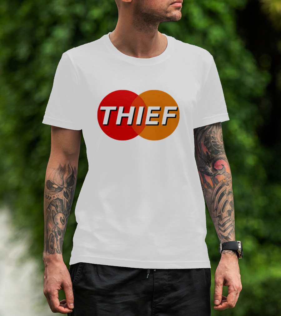 The MasterCard Parody THIEF T-shirt is designed for everyday wear and a consistent fit. Fabric is pre-shrunk ring-spun cotton with durable stitching. See the size chart below for exact measurements.