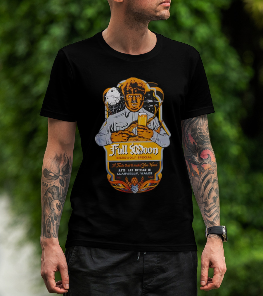 Full Moon Bierewolf Special A Taste That’ll Make You Howl Llanwelly Wales Vintage Werewolf Pub Label T-Shirt