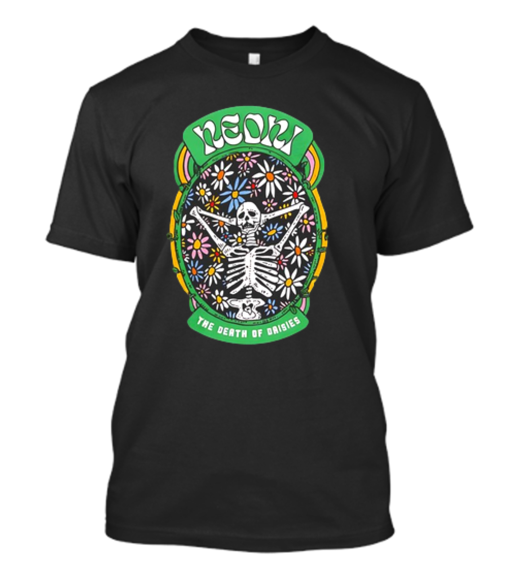 The Neoni Skeleton Surrounded by Colorful Daisies T-shirt is designed for everyday wear and a consistent fit. Fabric is pre-shrunk ring-spun cotton with durable stitching. See the size chart below for exact measurements.