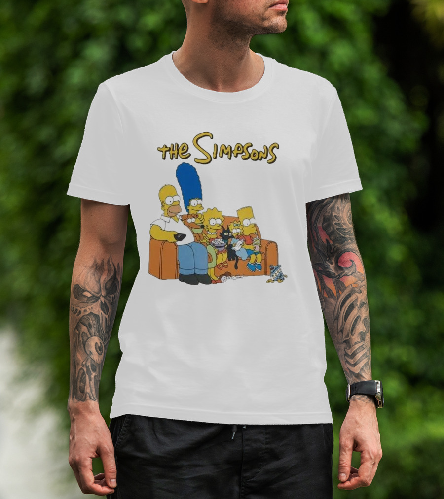 The The Simpsons Couch Family Scene with Homer Marge Bart Lisa Maggie and Pets T-shirt is designed for everyday wear and a consistent fit. Fabric is pre-shrunk ring-spun cotton with durable stitching. See the size chart below for exact measurements.
