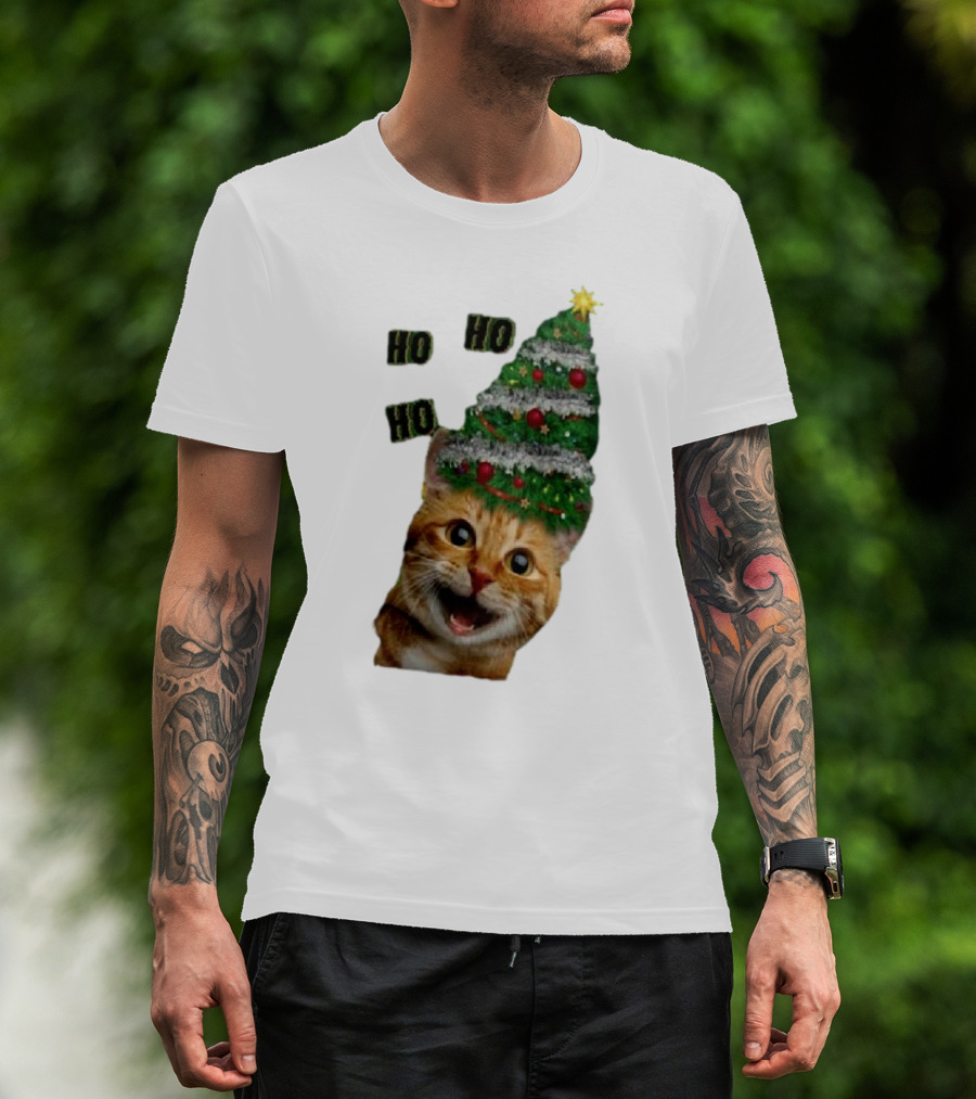 Cat With Christmas Tree Hat Ho Ho Ho Christmas T-Shirt
