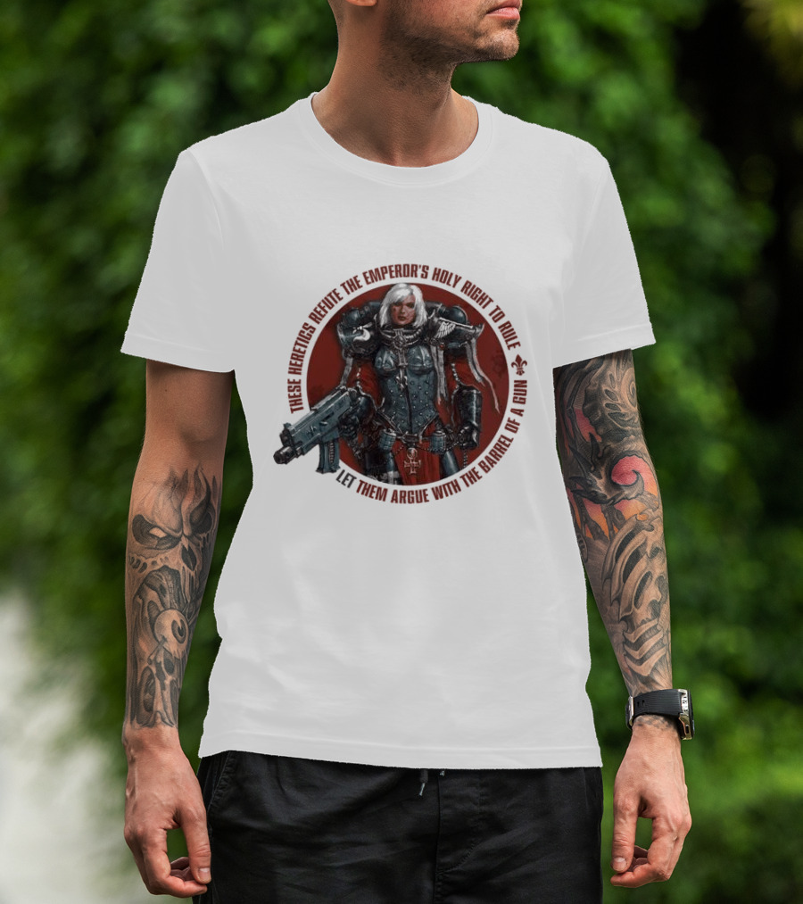 These Heretics Refute The Emperor’s Holy Right To Rule Let Them Argue With The Barrel Of A Gun Warhammer 40K Adepta Sororitas Sister Of Battle Power Armor Fleur De Lis T-Shirt
