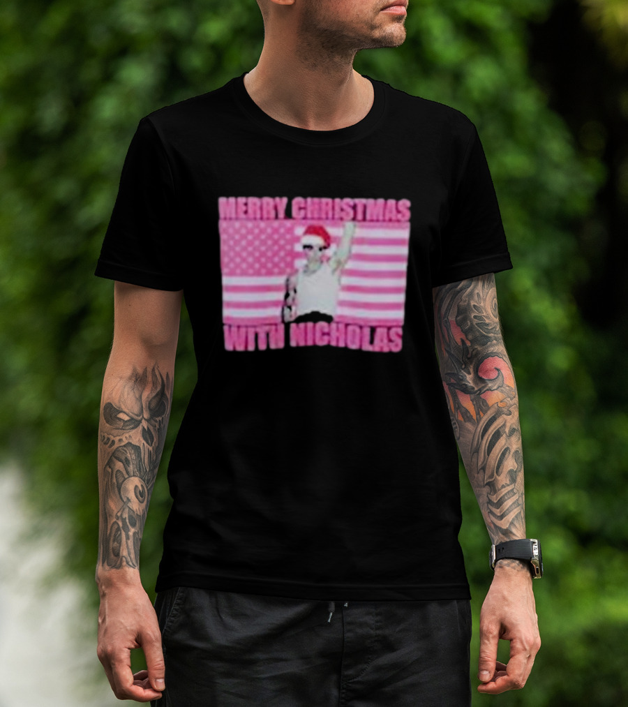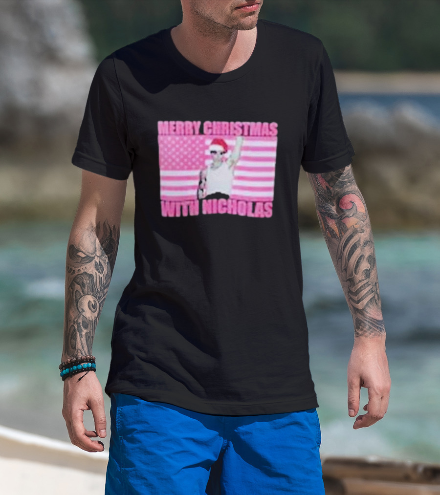 Merry Christmas With Nicholas Festive Santa Hat USA Flag T-Shirt