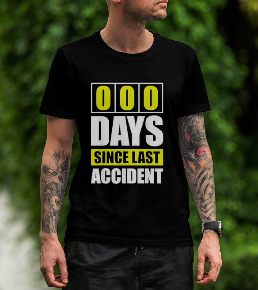 The 000 Days Since Last Accident T-shirt is designed for everyday wear and a consistent fit. Fabric is pre-shrunk ring-spun cotton with durable stitching. See the size chart below for exact measurements.