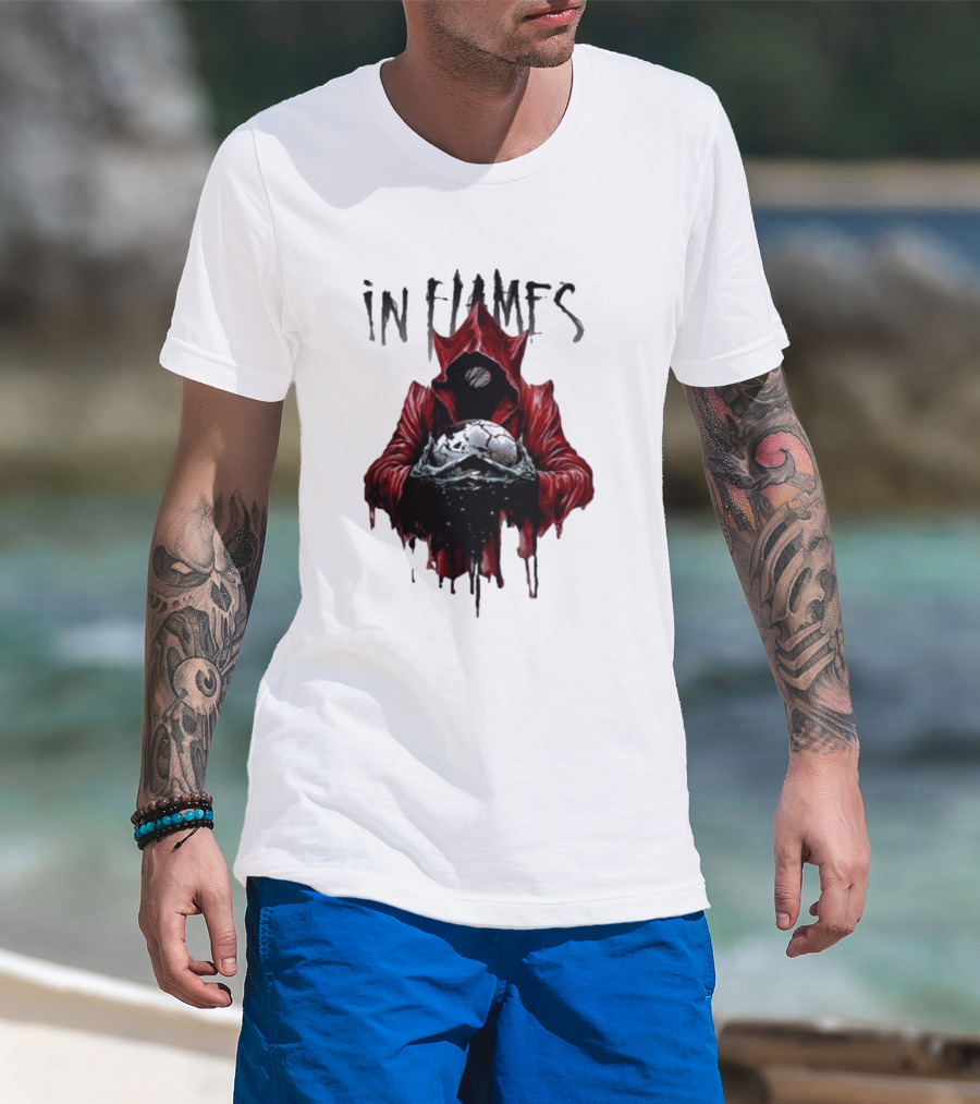 In Flames Siren Charms Red Hooded Figure Holding Cracked Mask T-Shirt