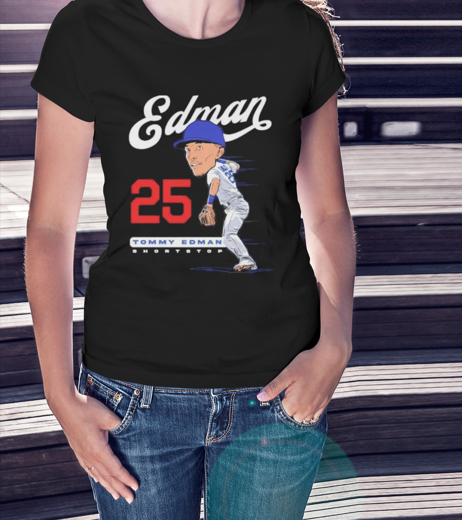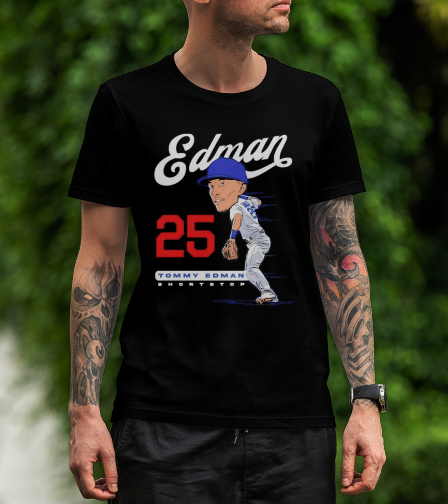 The Edman 25 Tommy Edman Shortstop Cartoon T-shirt is designed for everyday wear and a consistent fit. Fabric is pre-shrunk ring-spun cotton with durable stitching. See the size chart below for exact measurements.