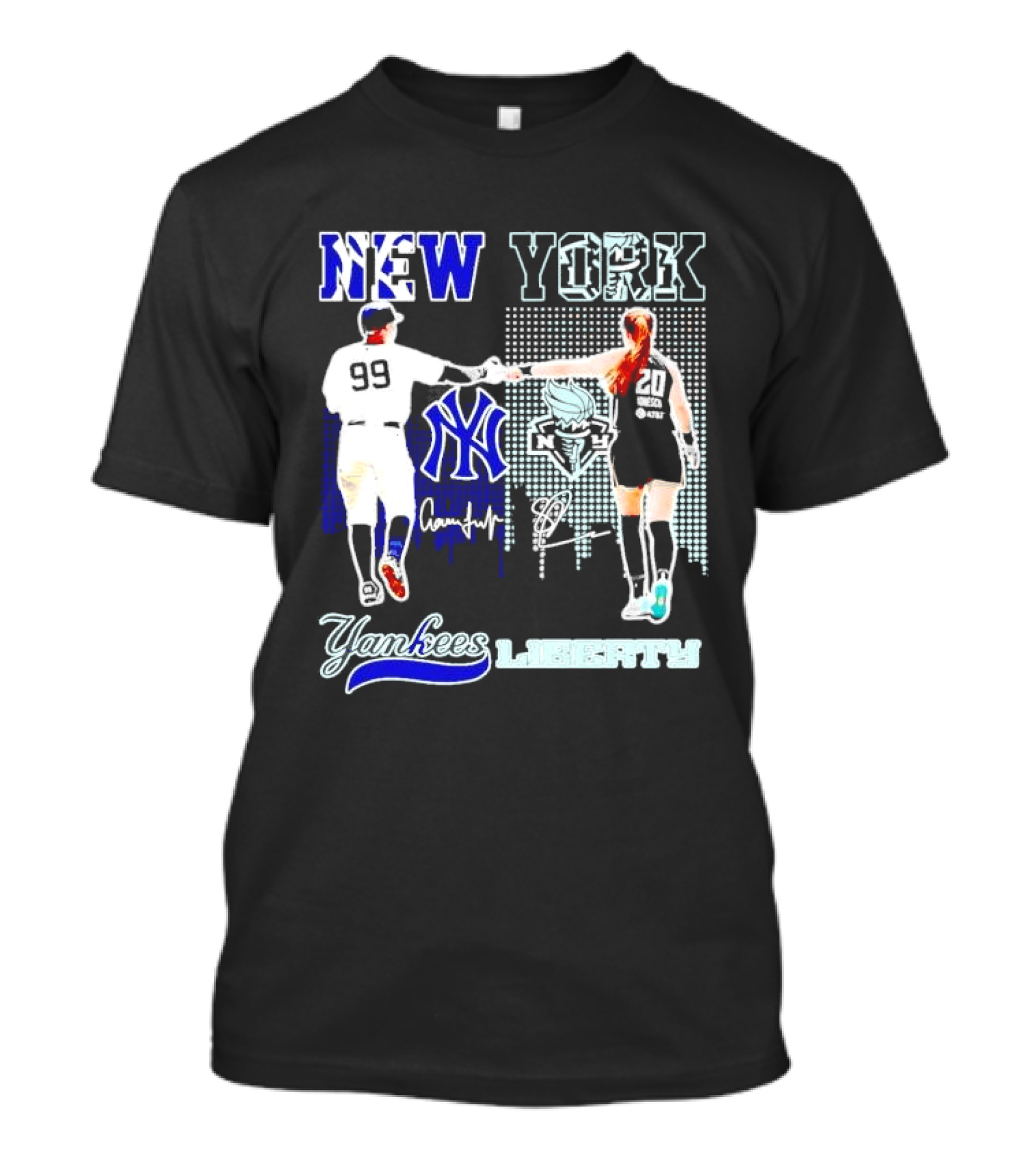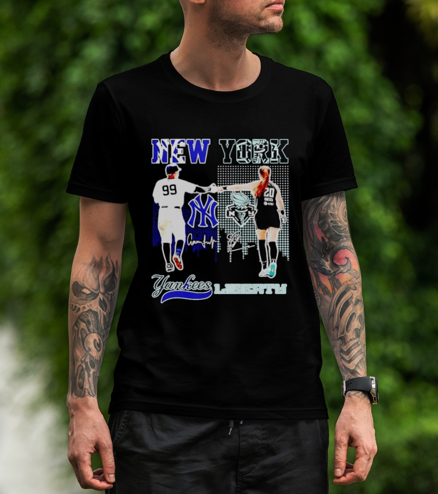 New York Yankees Yankees Aaron Judge Liberty Sabrina Ionescu Signatures Skyline T-Shirt