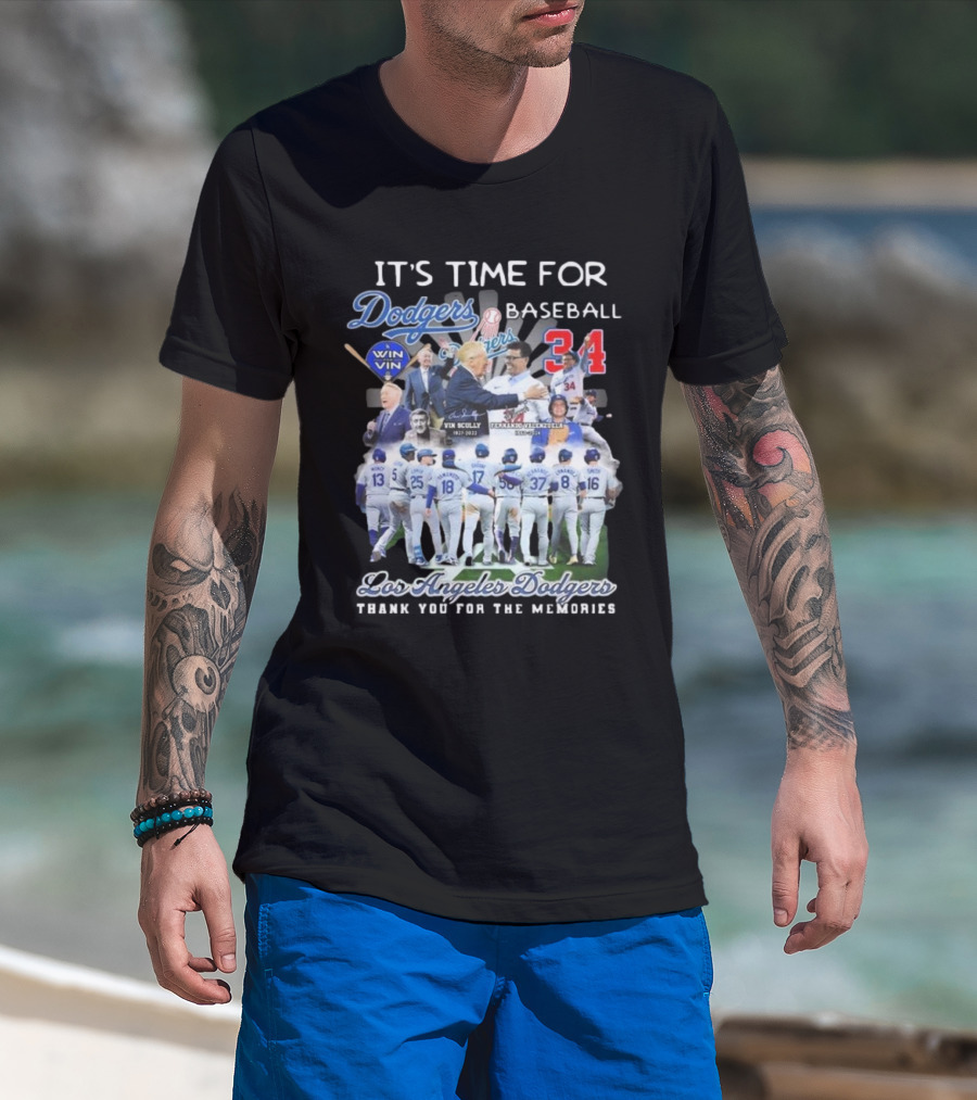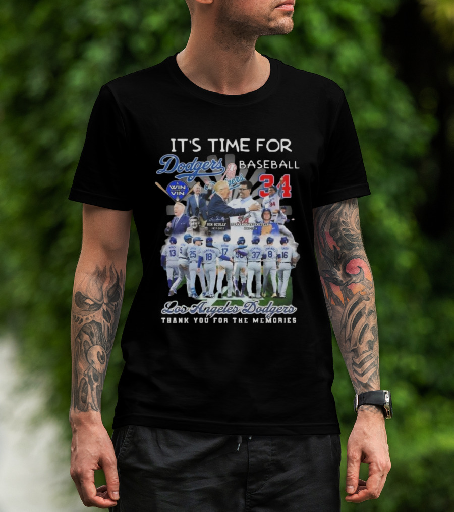 Los Angeles Dodgers It's Time For Baseball Thank You For The Memories Vin Scully 34 Signatures T-Shirt